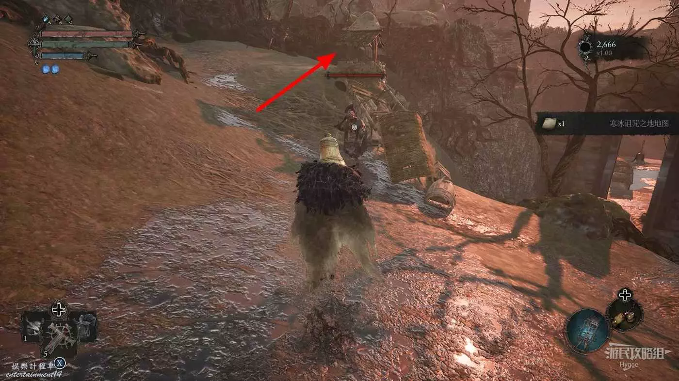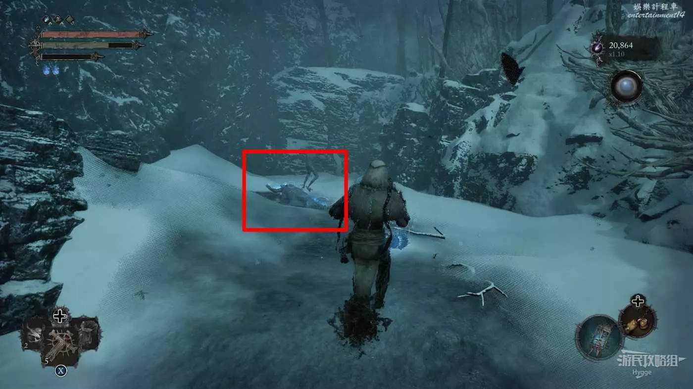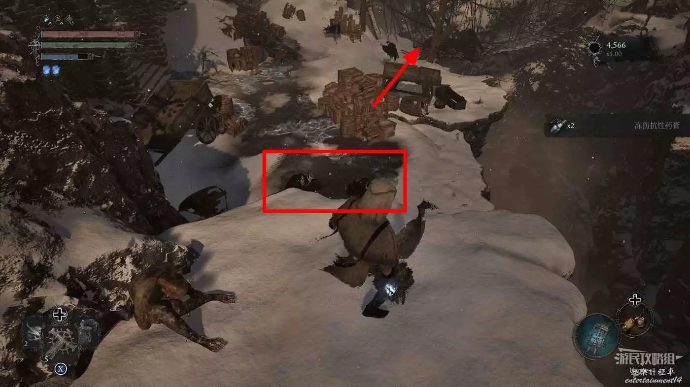 擊殺前方洞口的一名敵人後在山洞旁的屍體上可以撿到【寒冰詛咒之地地圖】。