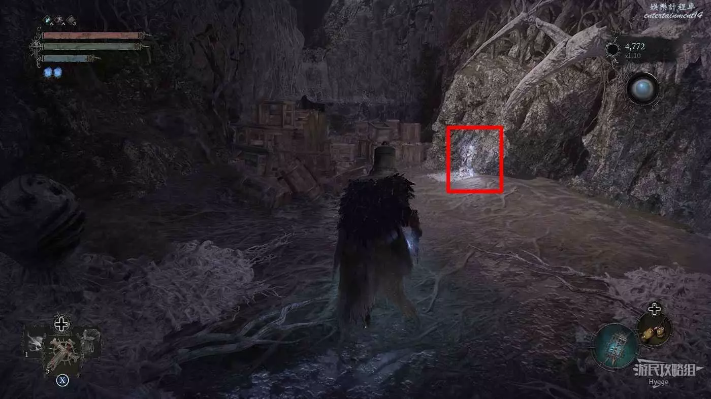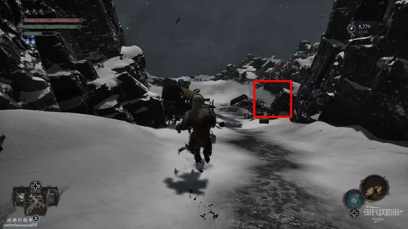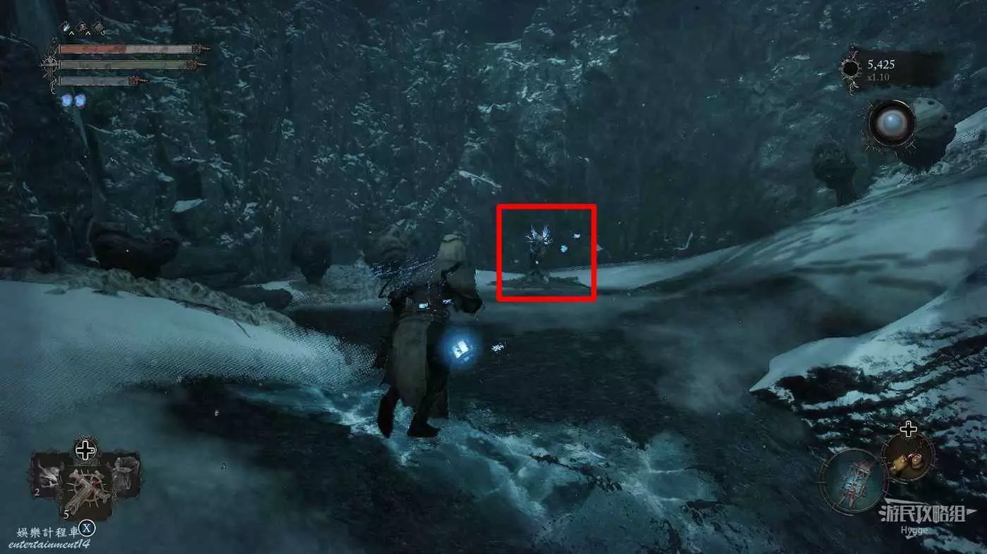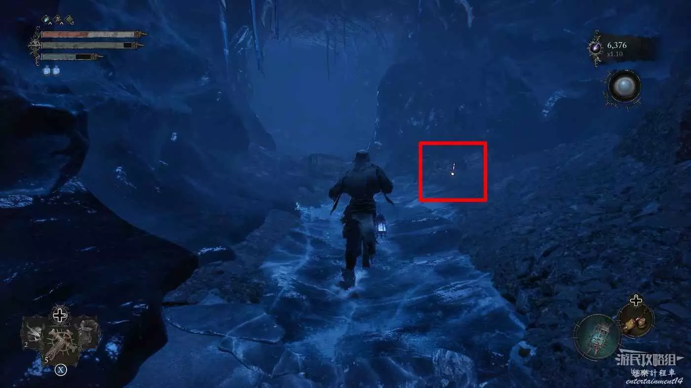 擊殺前方洞口的一名敵人後在山洞旁的屍體上可以撿到【寒冰詛咒之地地圖】。