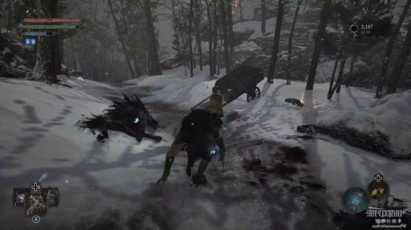 在前方馬車旁邊可以撿到新的顏色【無法無天】,附近有三隻冰狼注意提防。