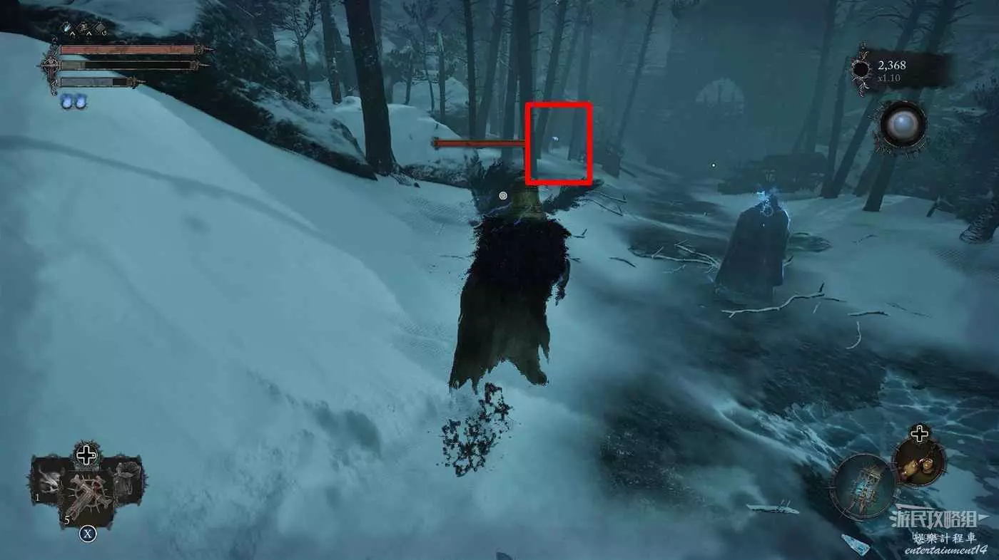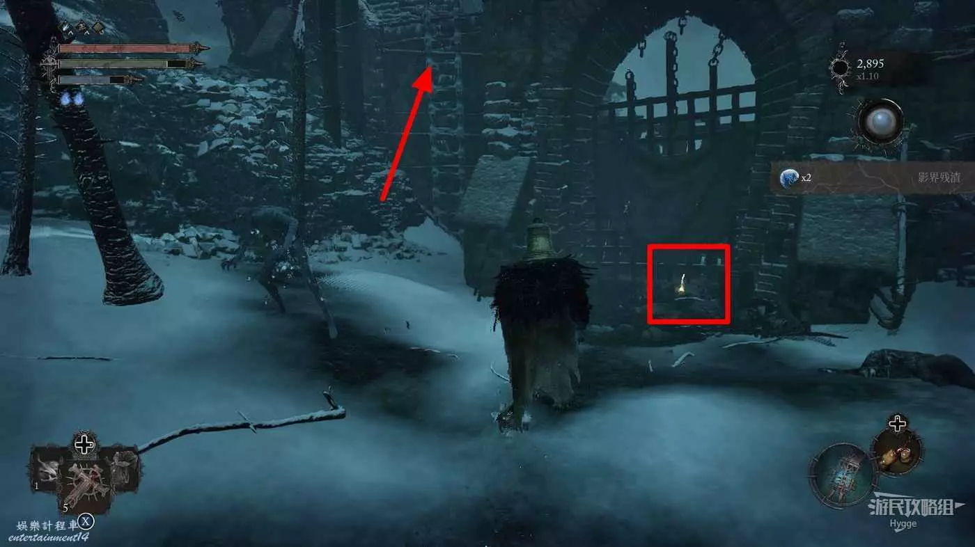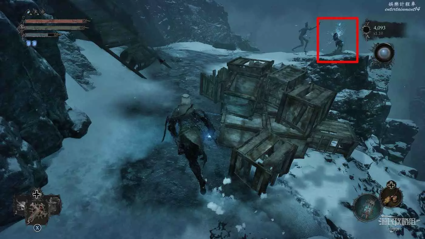 在前方擊殺一名獵手和兩隻冰狼後進入影界,獵手會進入隱身狀態,但他的藍色眼睛會暴露他的位置。