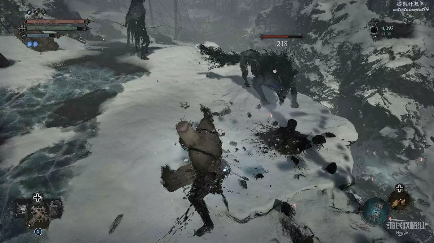 通過前方平臺的梯子向下,擊殺一隻火狼和一名雙斧戰士。