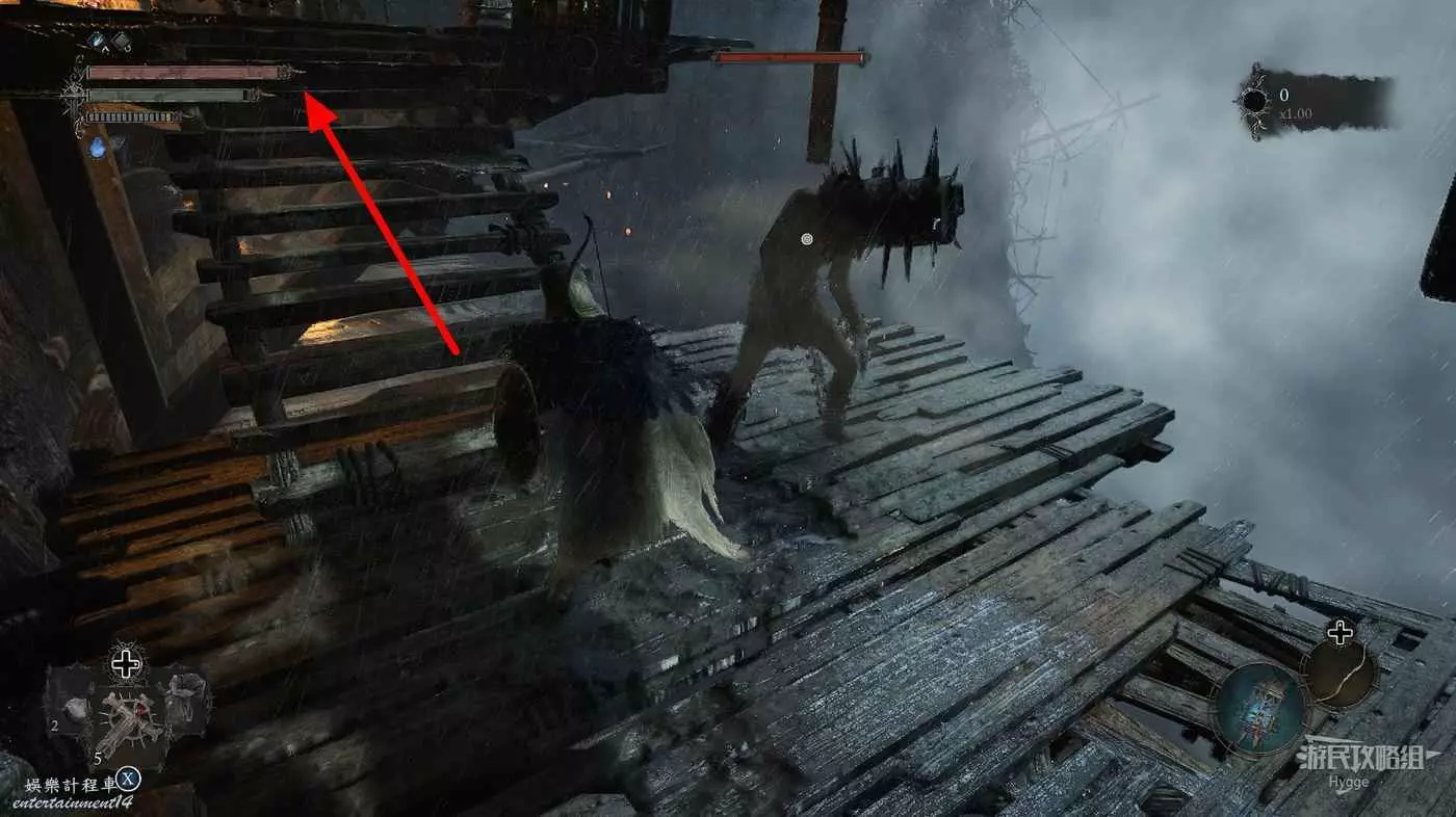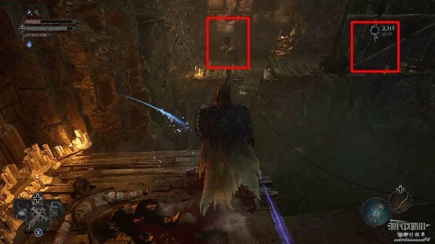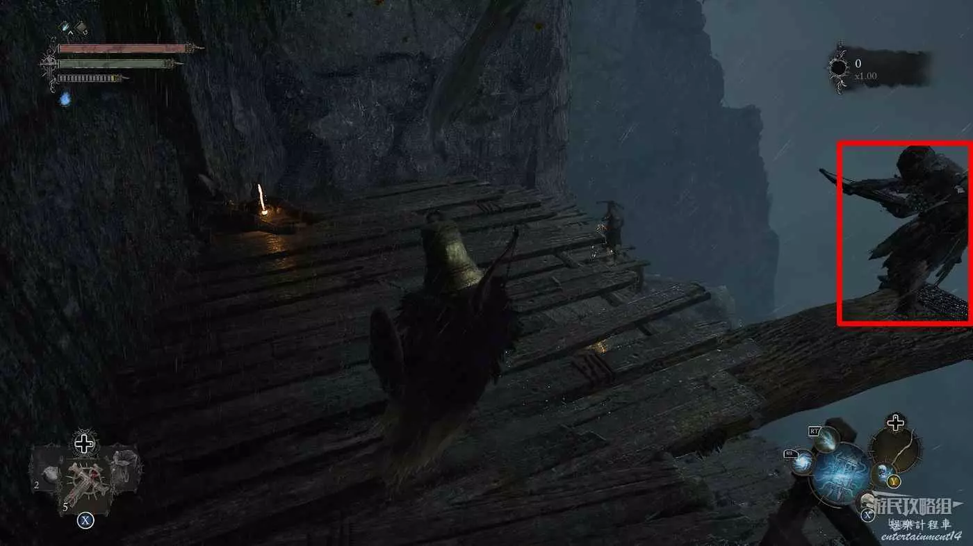 在吊橋上撿到一些道具後,在對岸左側有一名守護者,右側有一名獵手。建議先將獵手引過來,將其消滅後再對付守護者。
