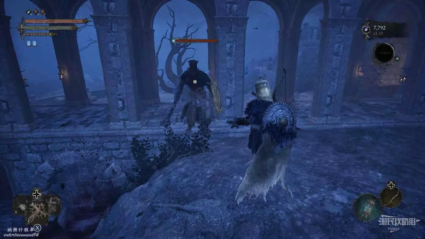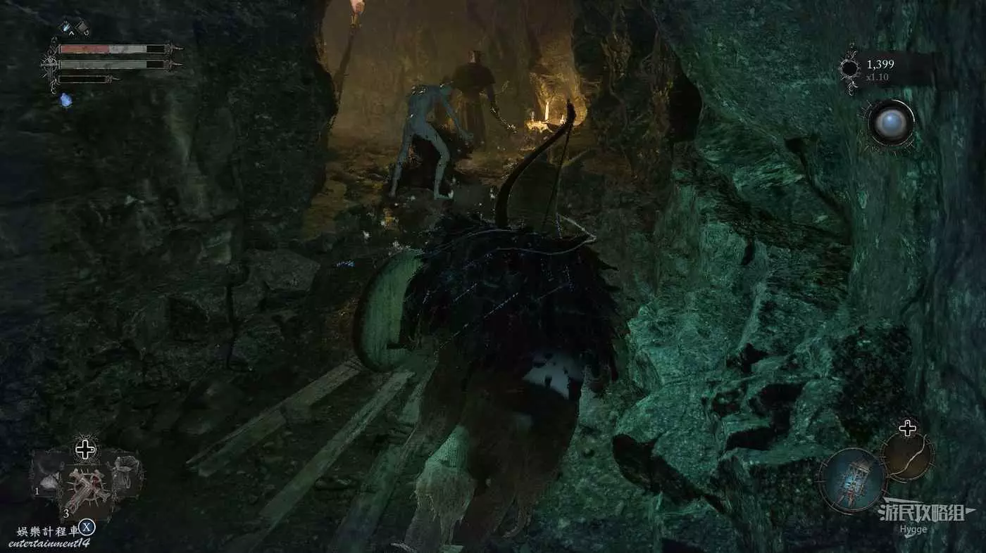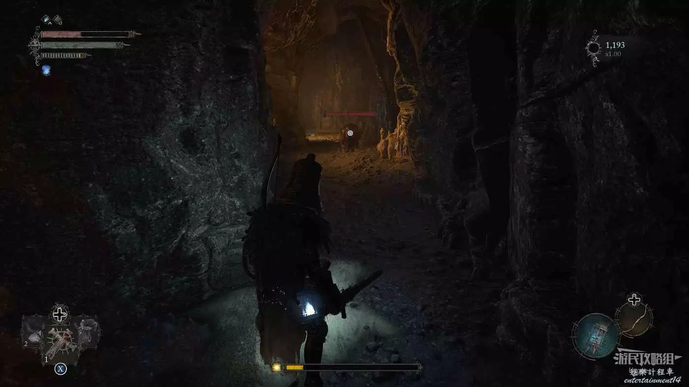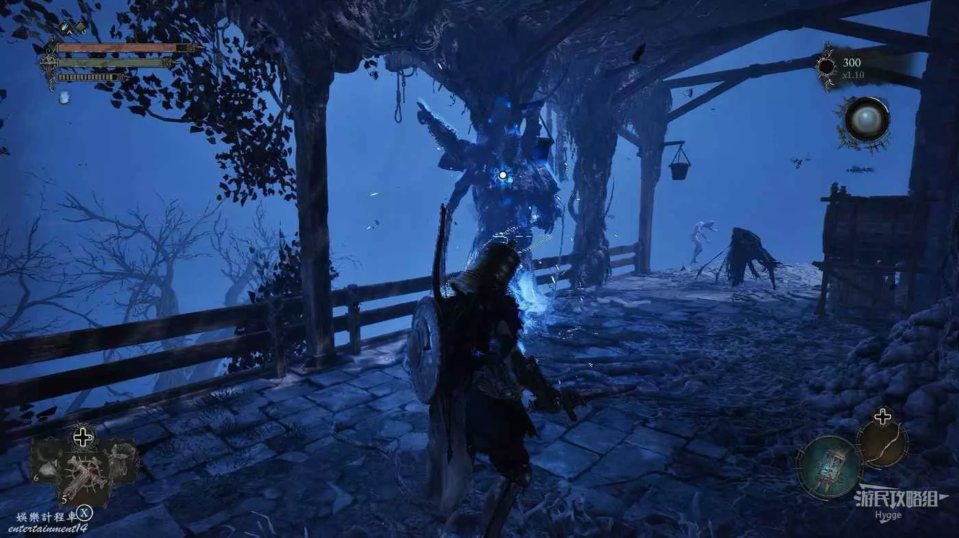 在吊橋上撿到一些道具後,在對岸左側有一名守護者,右側有一名獵手。建議先將獵手引過來,將其消滅後再對付守護者。