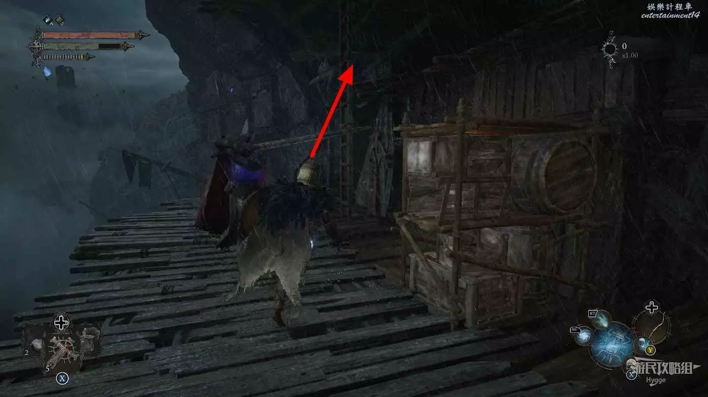 隨後來到右側平臺,牽引靈魂移動平臺,通過平臺前的梯子向上。