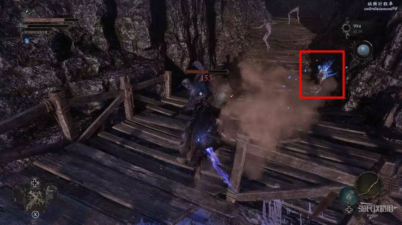 在石橋左側通過缺口跳到下層,從空中發動偷襲擊殺下方的劍士。