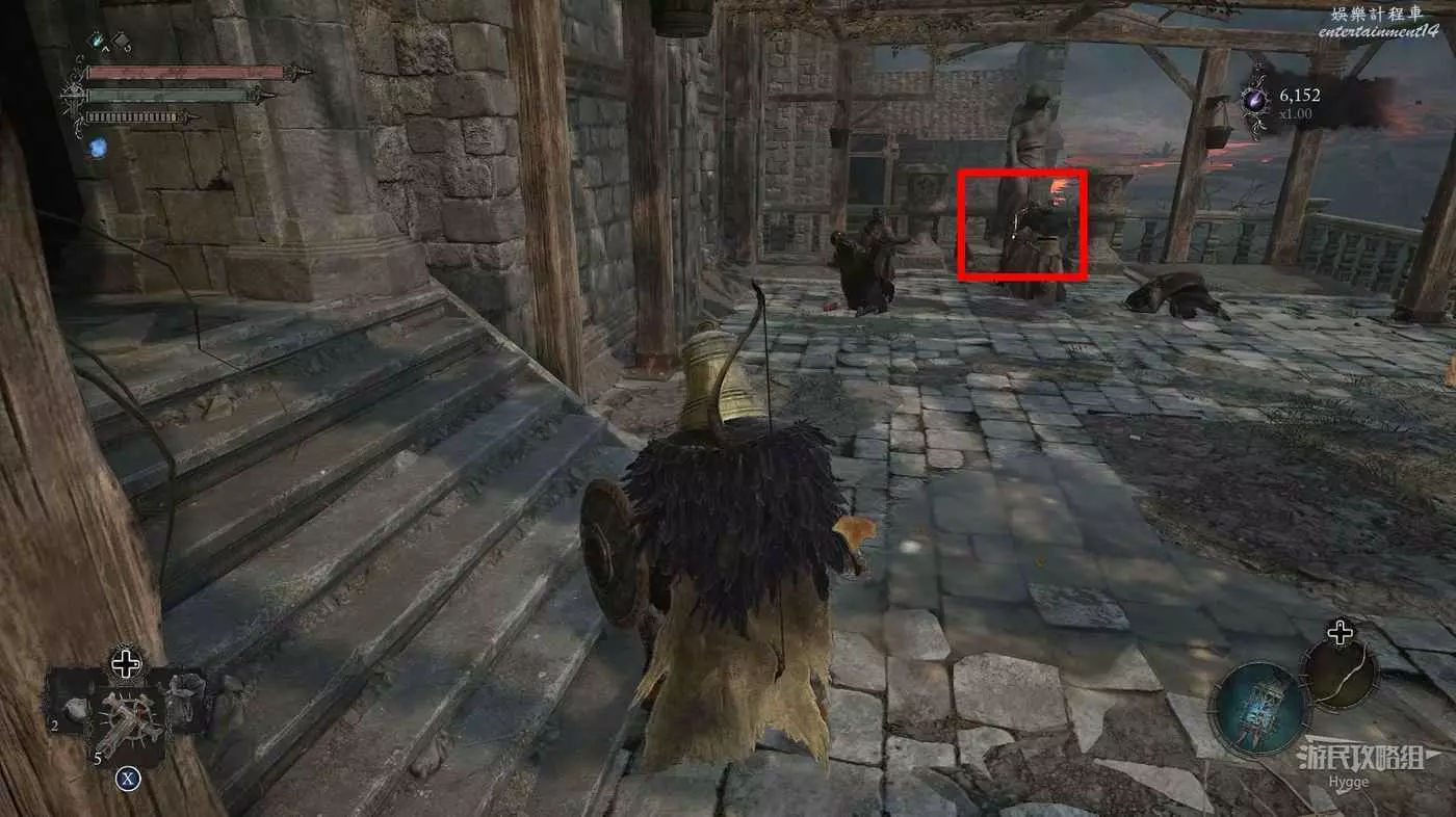 沿著房間邊緣處走到露臺上,拿到一些道具,注意右側的牆後藏著一名法師。