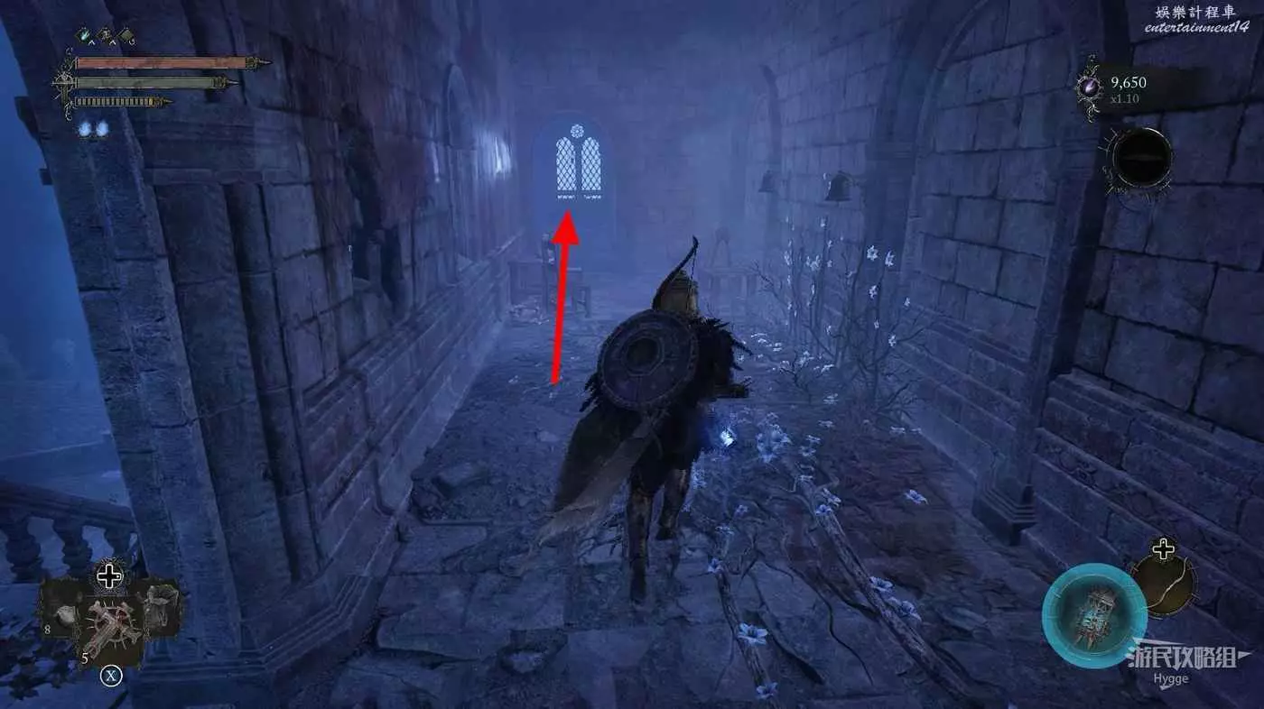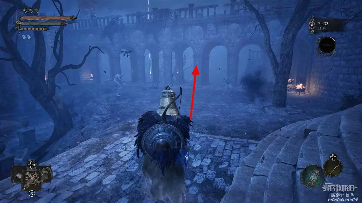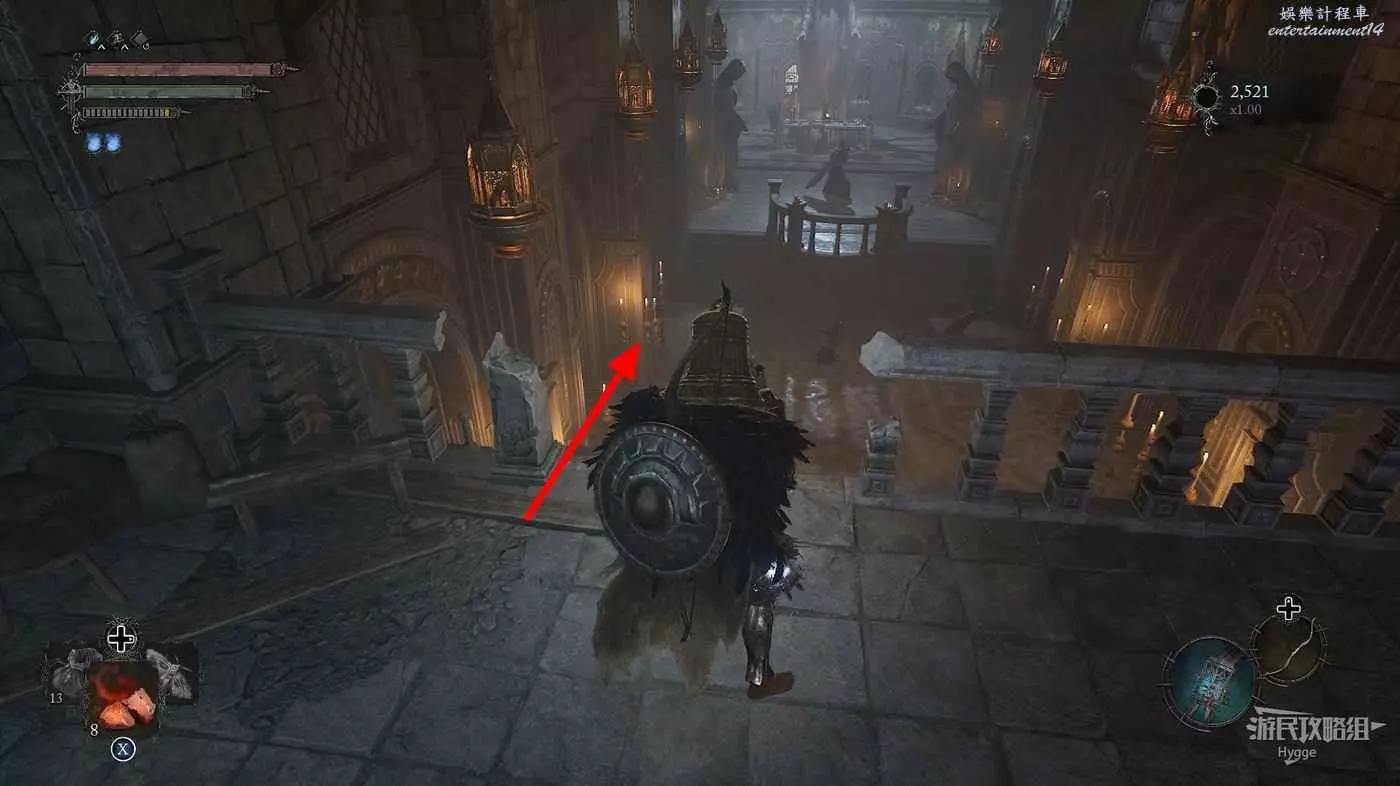 在露臺上的雕像前可以拿到武器【三位一體盾牌】,注意此處身後的光點是一個影界陷阱。
