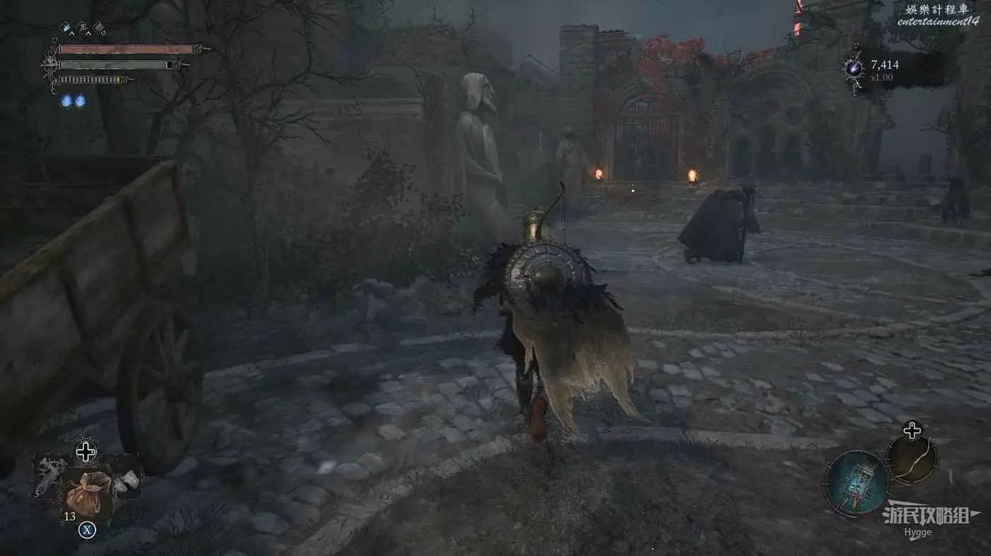 庭院中有兩名釘頭錘武士,可以打也可以直接跑走。此處的影界中有一隻虛偽面容,如果不小心在此處進入了影界,建議快跑。