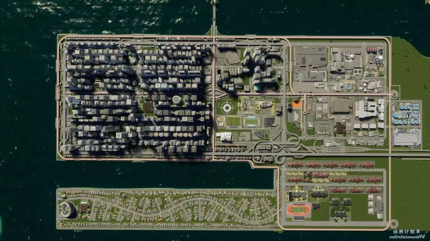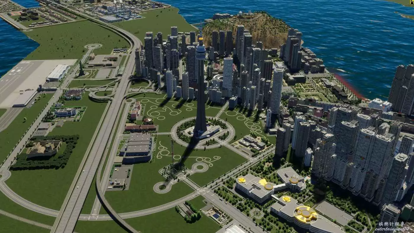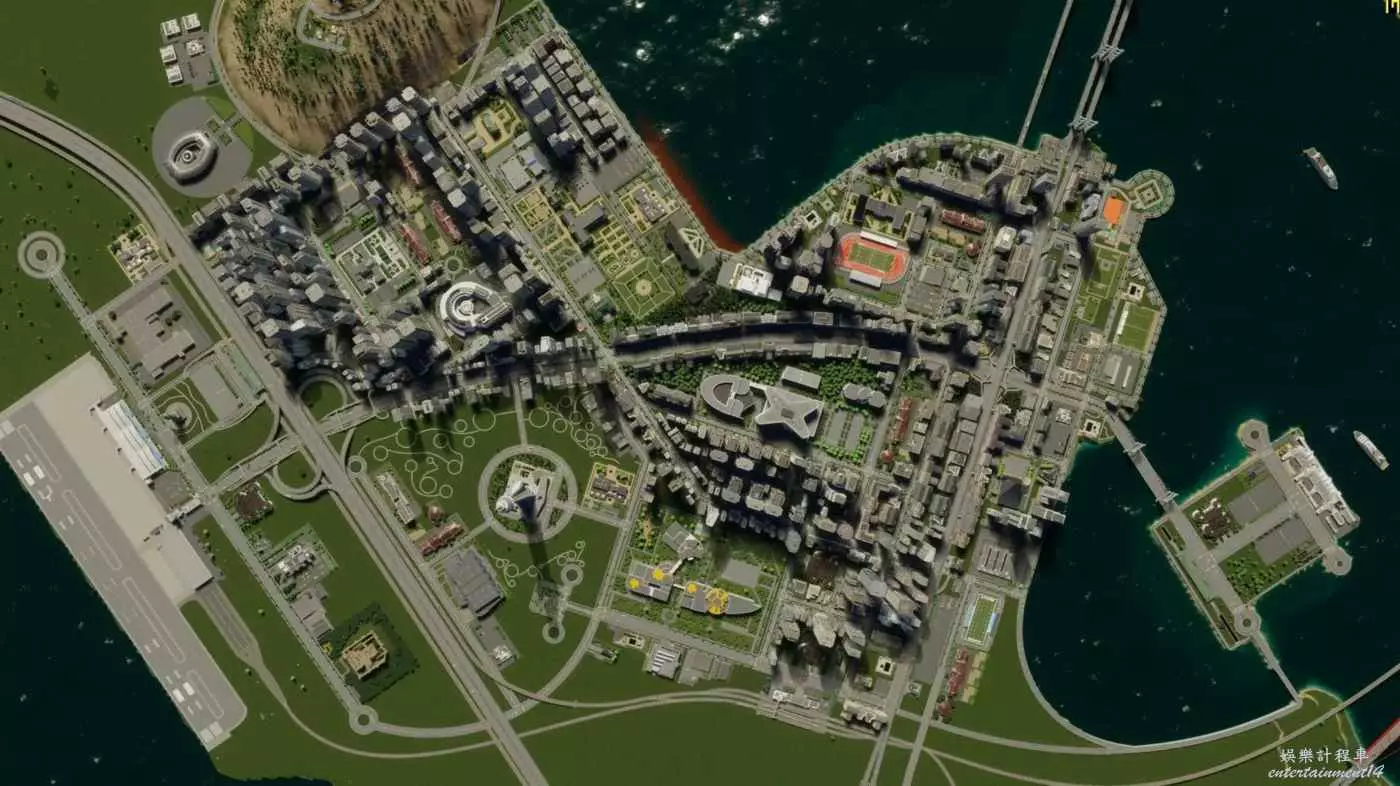 先發一下整體俯瞰圖,原本是規劃左中右三個城區,奈何人口增長太慢了後期,索性封檔後開開發者模式和解鎖全部建築造景玩了。