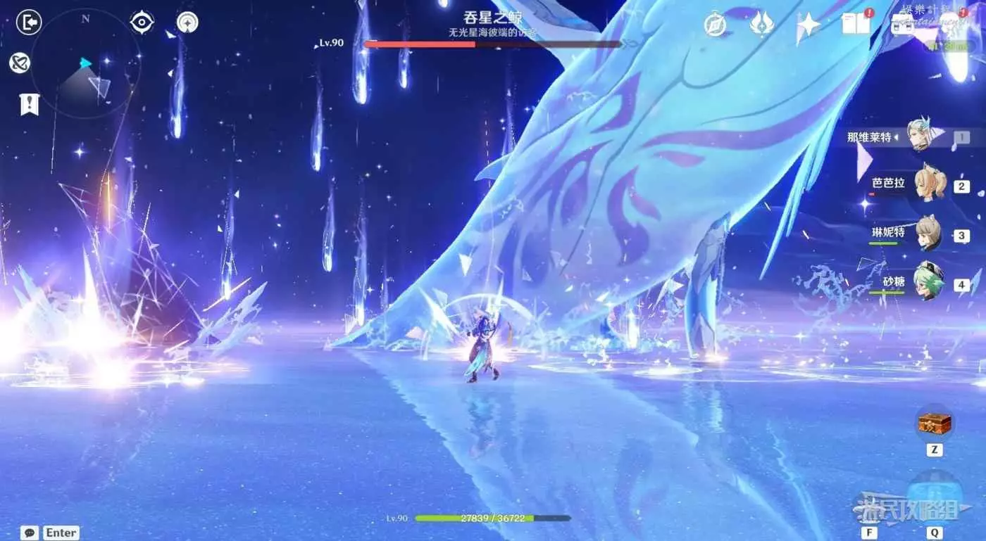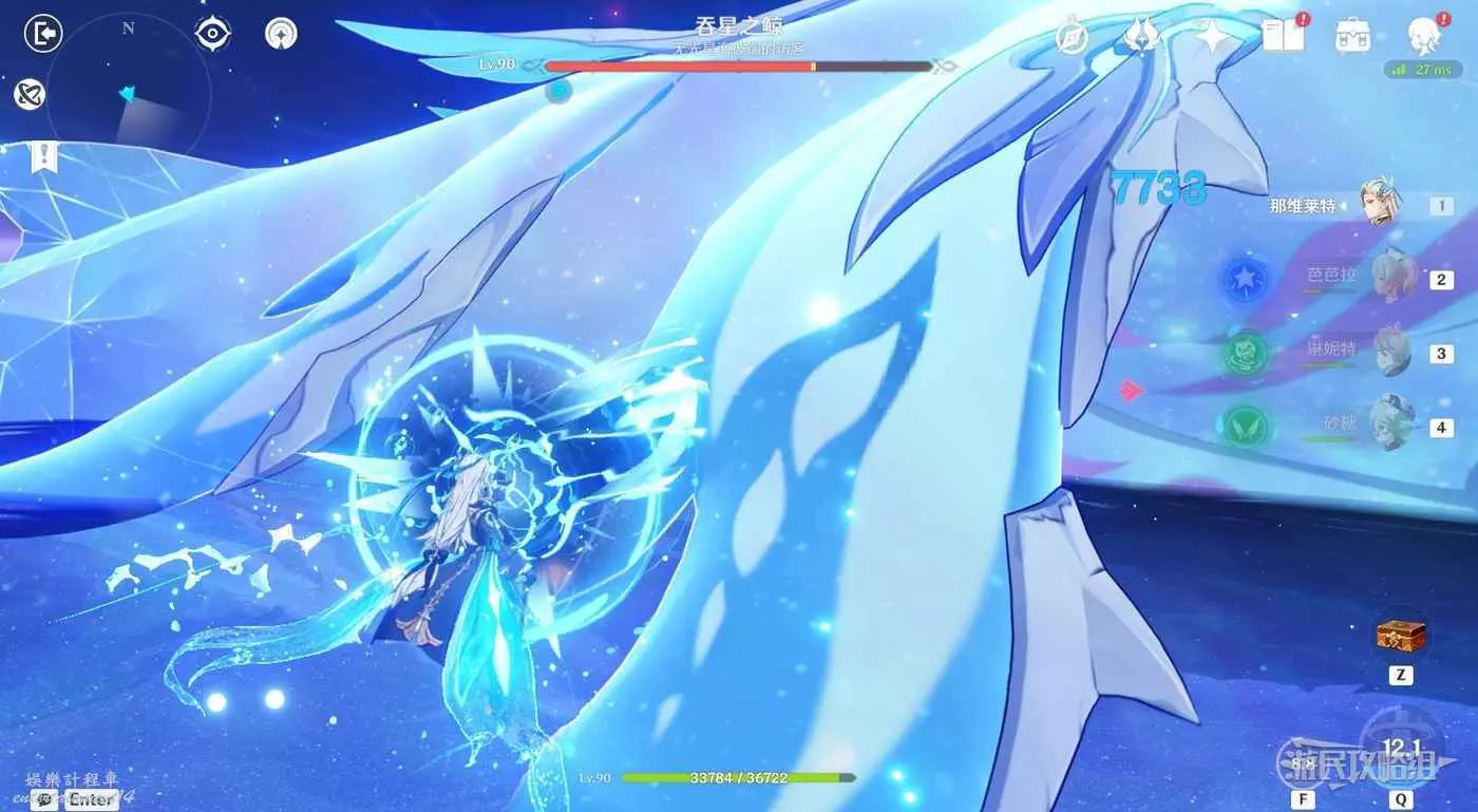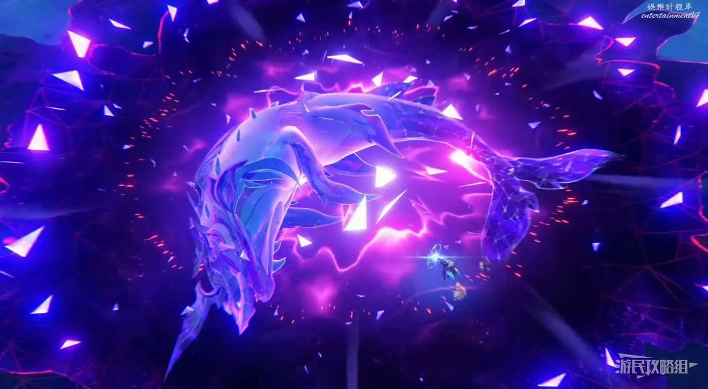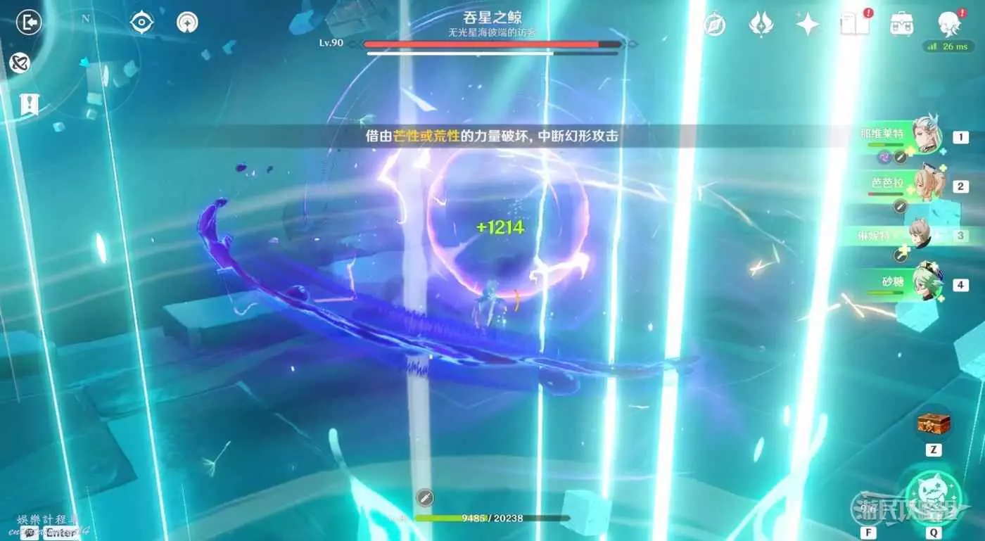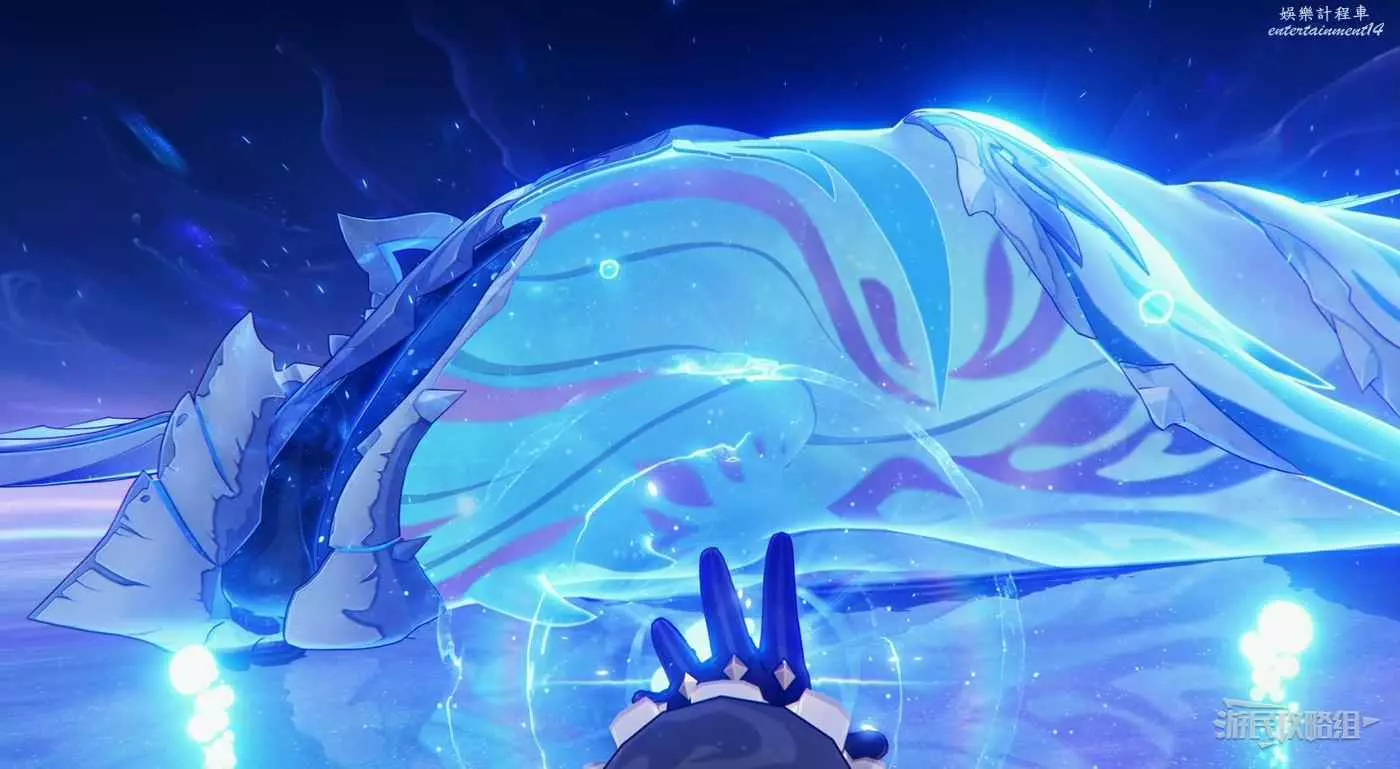 BOSS戰開始後,等待過劇情,那維萊特會提示我們使用帶有荒芒始基力的角色攻擊紫色圓球。然後繼續等待過劇情,被鯨魚吃掉後進入幻化世界。此處依然建議使用帶有芒荒始基力的角色快速破掉怪物的白條,用其他角色也可以,只是打得比較慢。