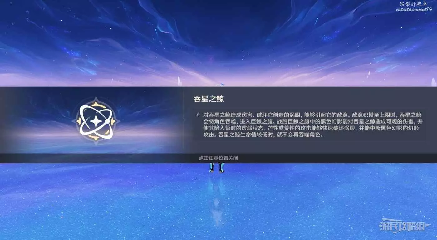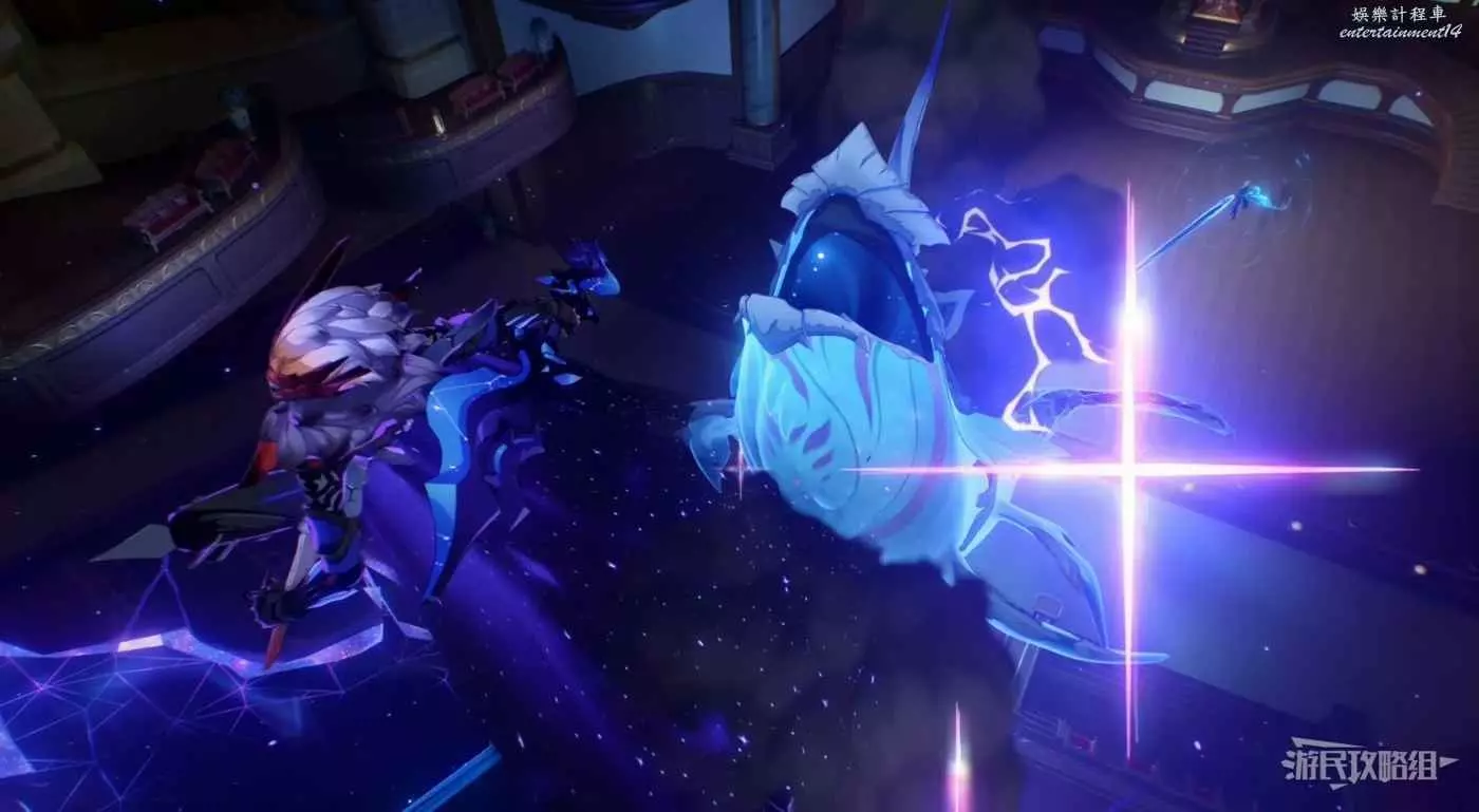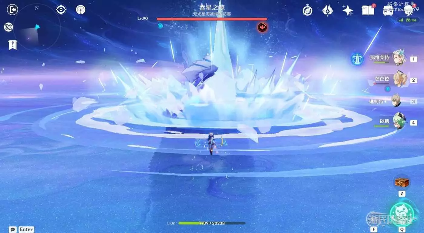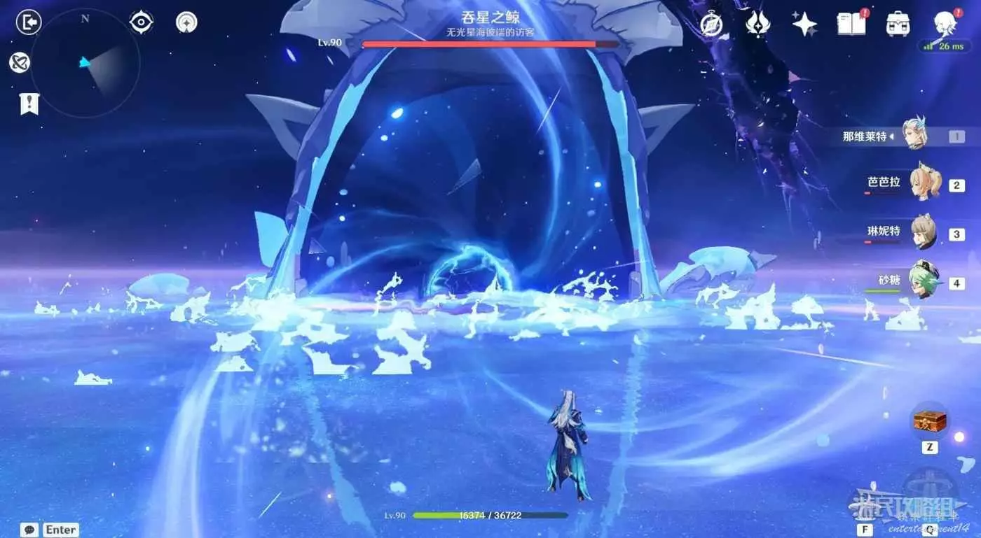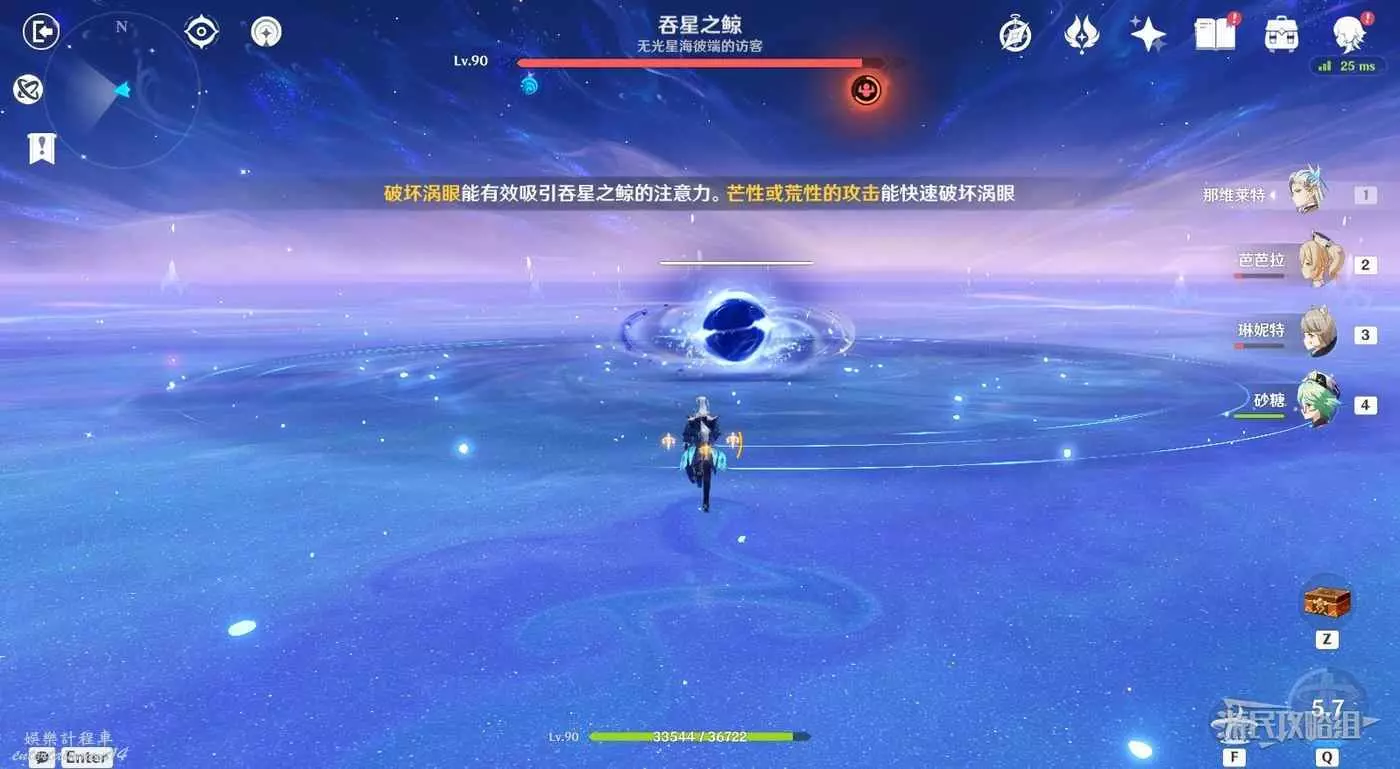 BOSS戰開始後,等待過劇情,那維萊特會提示我們使用帶有荒芒始基力的角色攻擊紫色圓球。然後繼續等待過劇情,被鯨魚吃掉後進入幻化世界。此處依然建議使用帶有芒荒始基力的角色快速破掉怪物的白條,用其他角色也可以,只是打得比較慢。