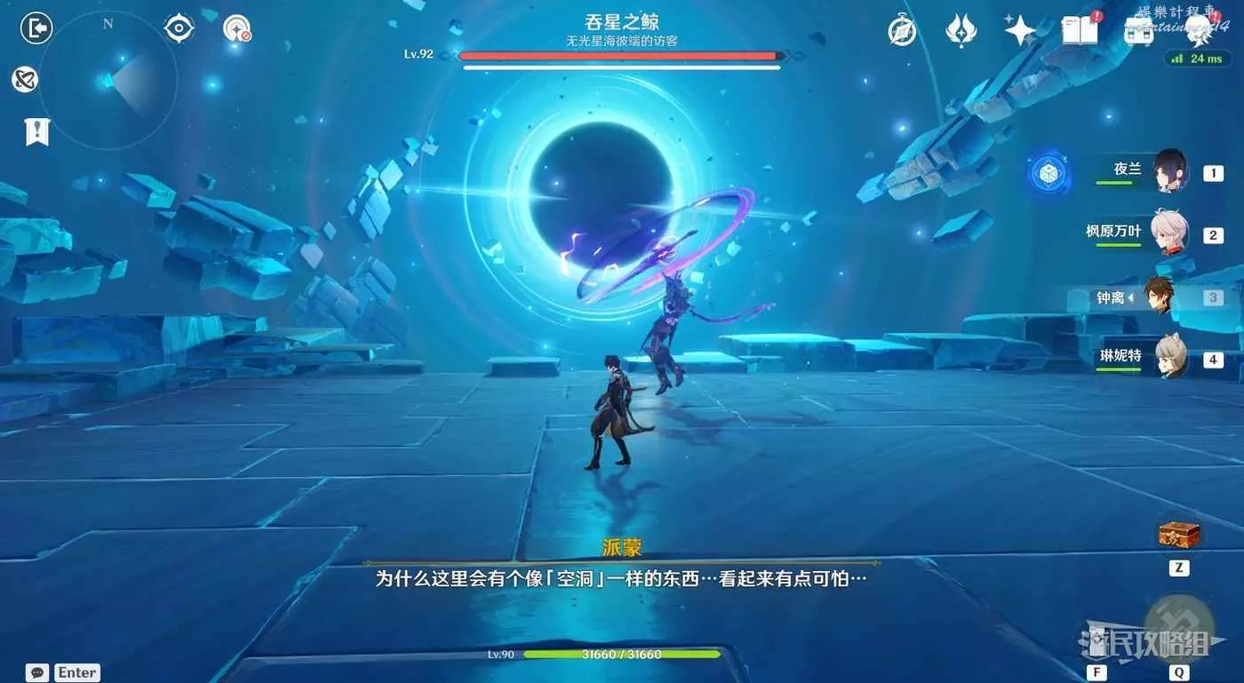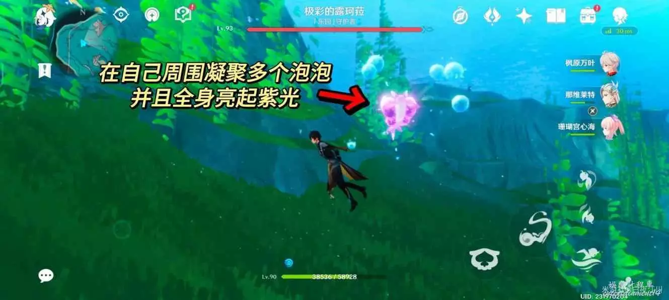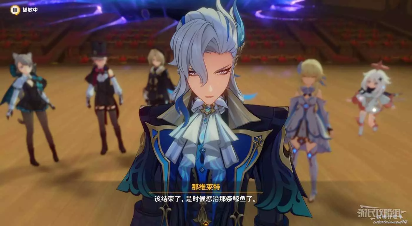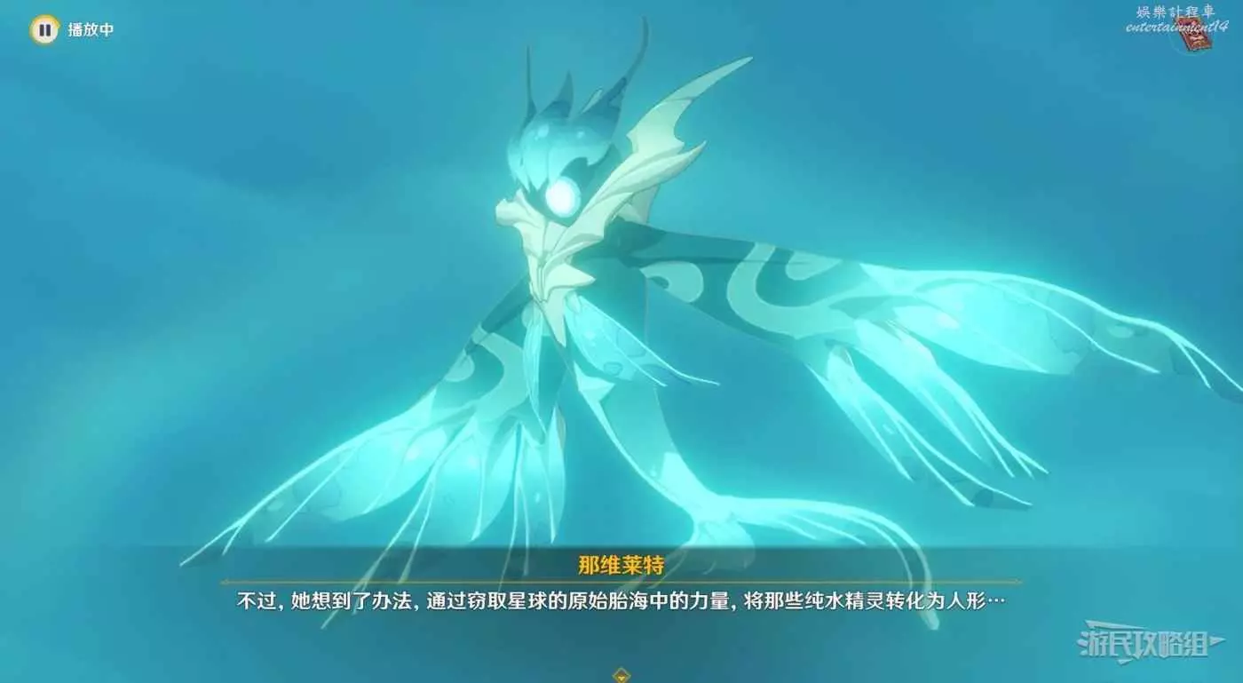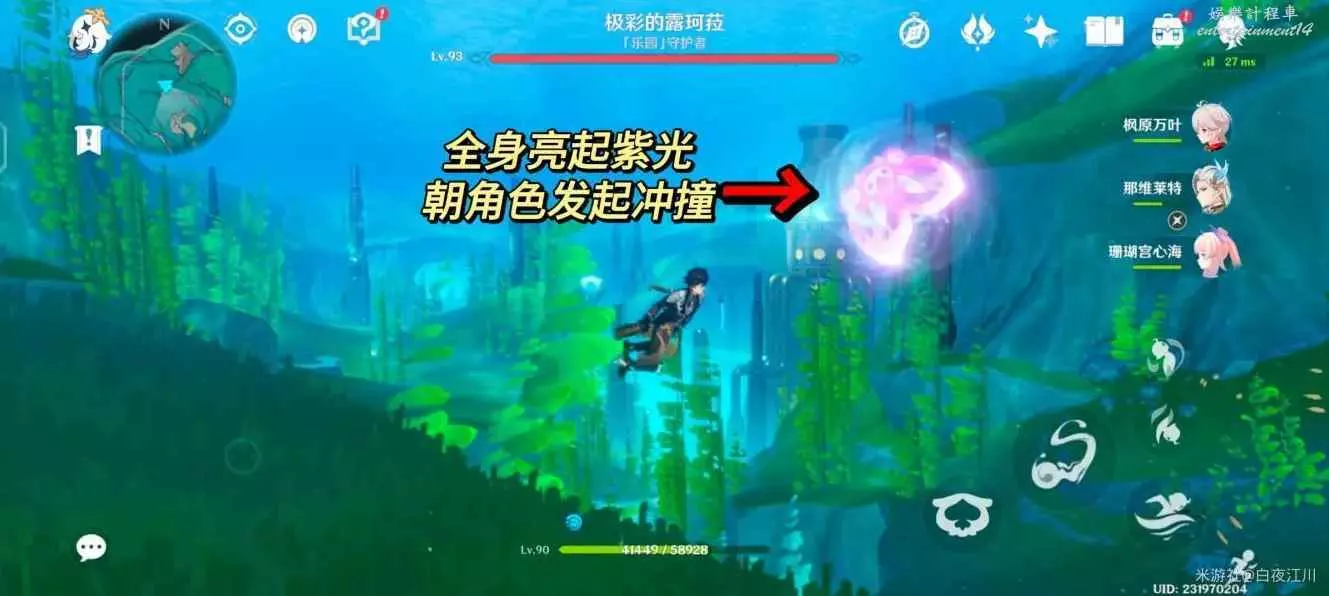 BOSS戰開始後,等待過劇情,那維萊特會提示我們使用帶有荒芒始基力的角色攻擊紫色圓球。然後繼續等待過劇情,被鯨魚吃掉後進入幻化世界。此處依然建議使用帶有芒荒始基力的角色快速破掉怪物的白條,用其他角色也可以,只是打得比較慢。