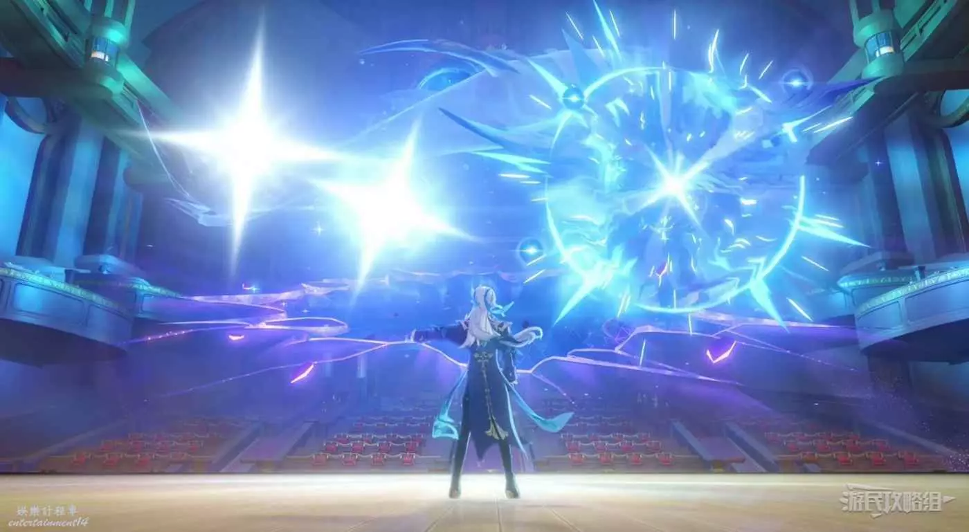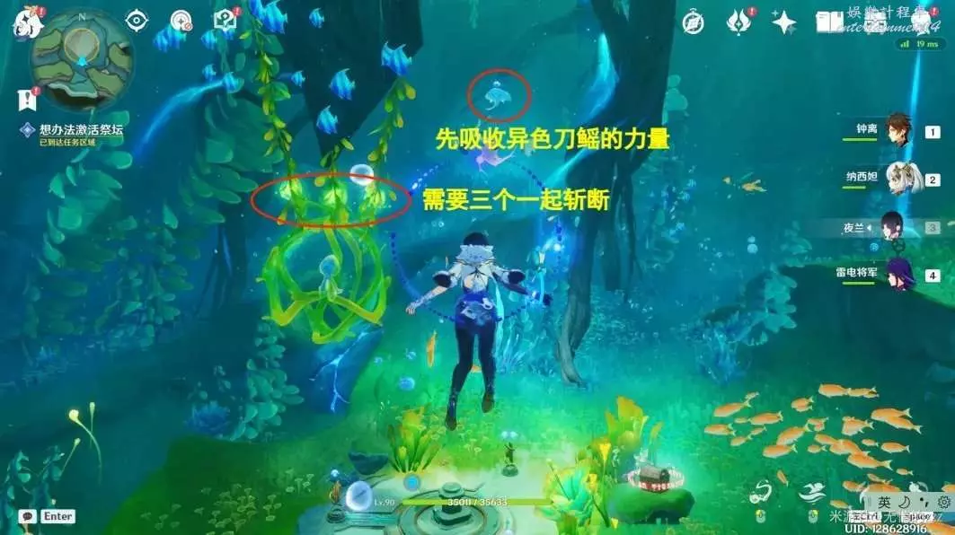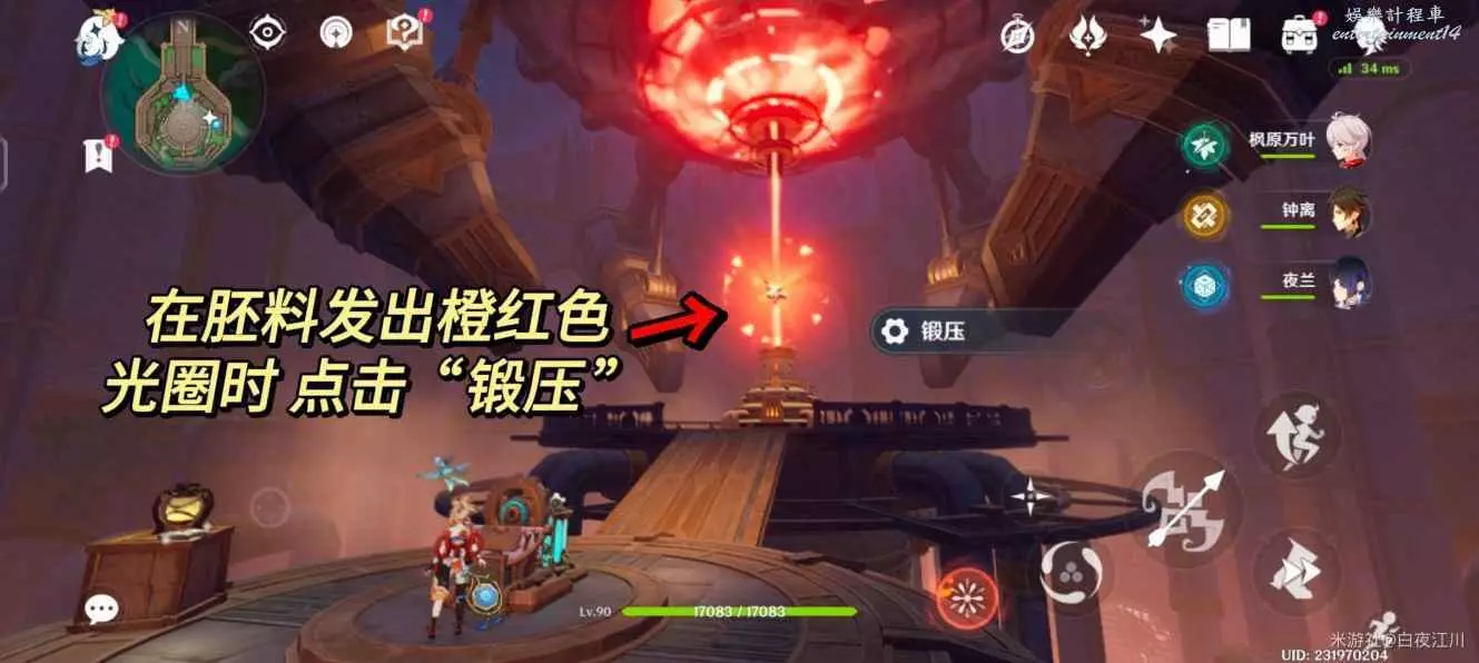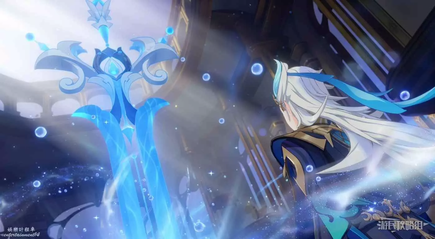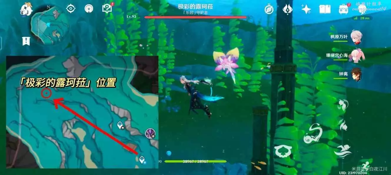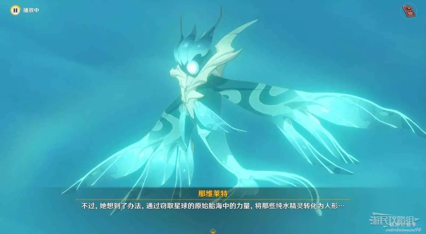 BOSS戰開始後,等待過劇情,那維萊特會提示我們使用帶有荒芒始基力的角色攻擊紫色圓球。然後繼續等待過劇情,被鯨魚吃掉後進入幻化世界。此處依然建議使用帶有芒荒始基力的角色快速破掉怪物的白條,用其他角色也可以,只是打得比較慢。