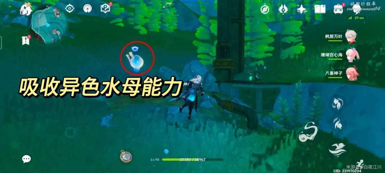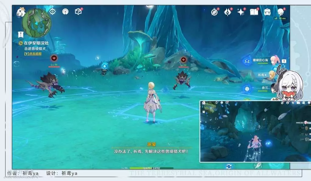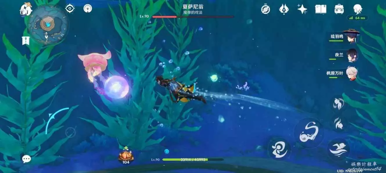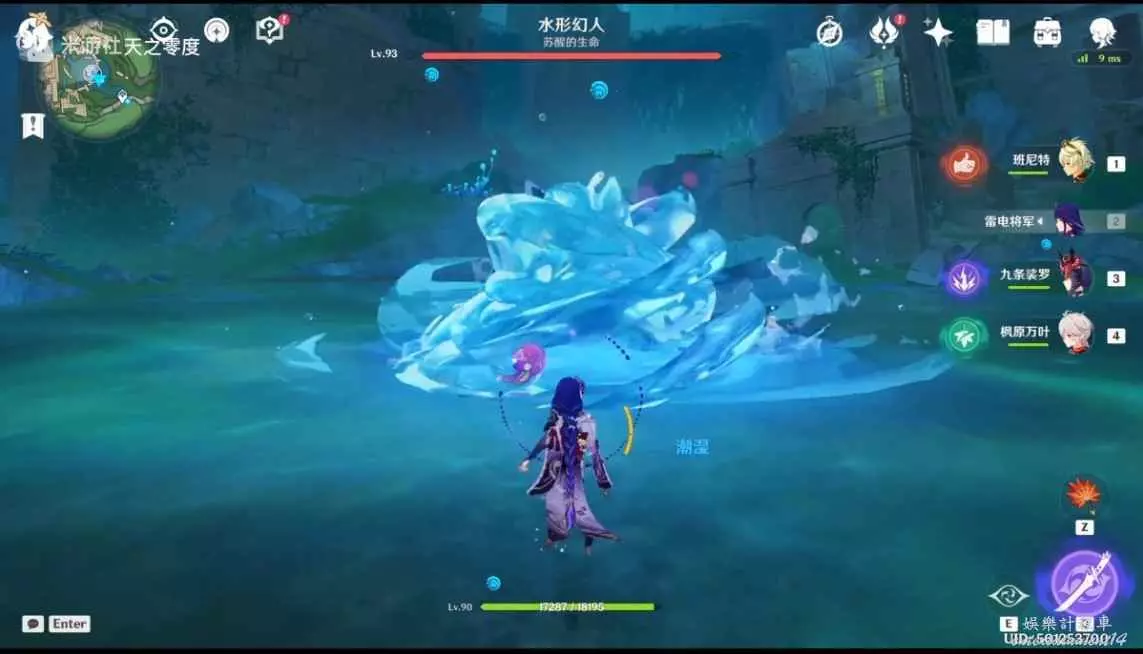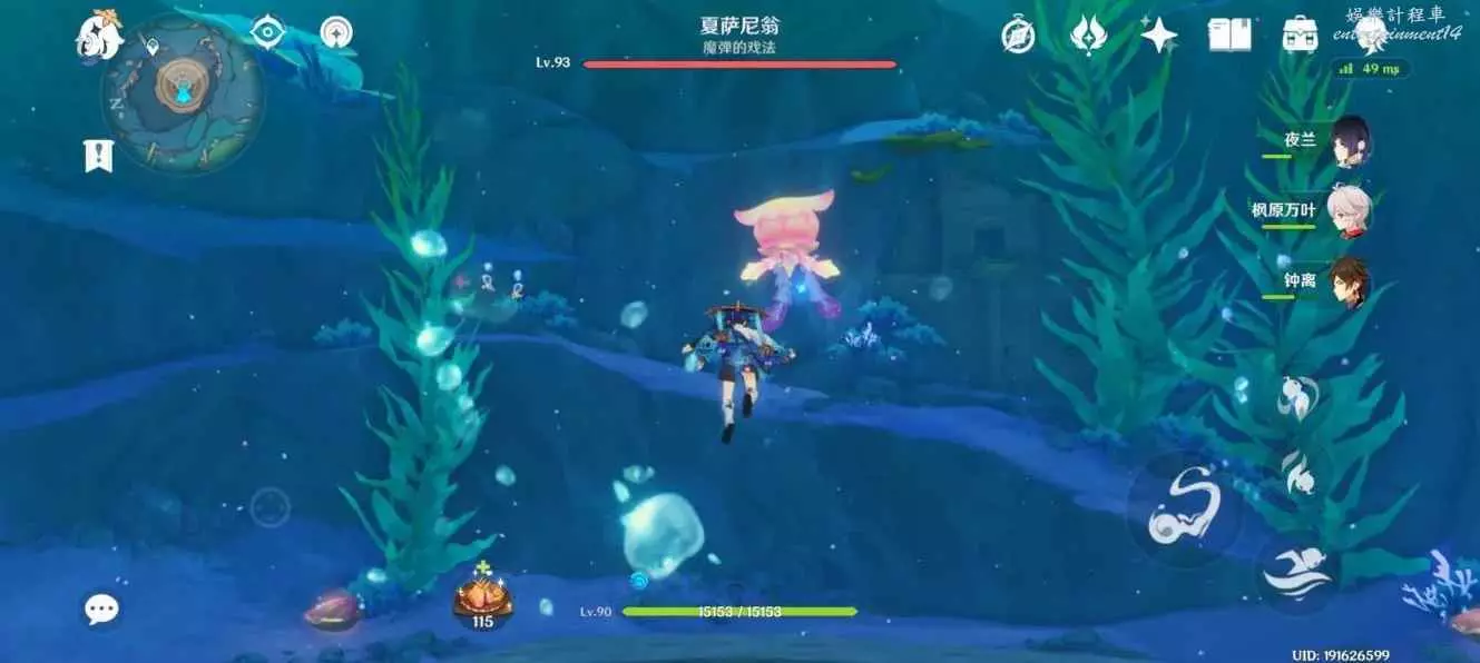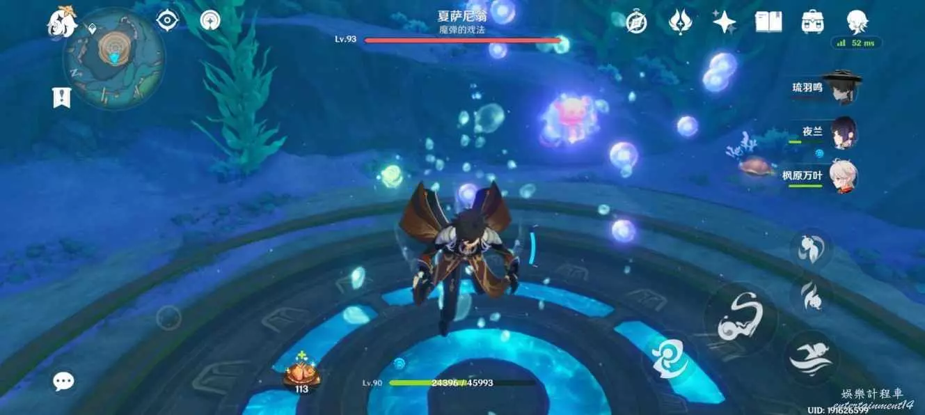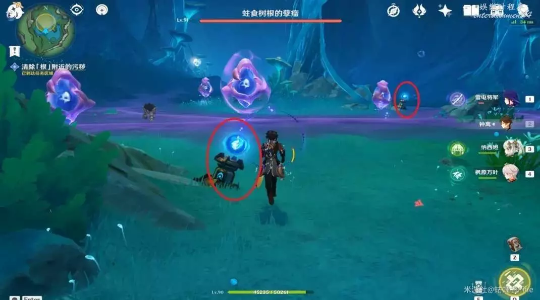BOSS戰開始後,等待過劇情,那維萊特會提示我們使用帶有荒芒始基力的角色攻擊紫色圓球。然後繼續等待過劇情,被鯨魚吃掉後進入幻化世界。此處依然建議使用帶有芒荒始基力的角色快速破掉怪物的白條,用其他角色也可以,只是打得比較慢。
