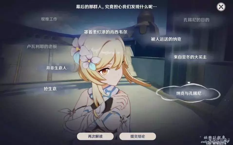 原神 (Genshin Impact) 一份預期內的計畫全流程攻略 9 11 月 2023-11-09 廣告 作者:淩鴒 來源:米遊社 柔燈港(4.2新地圖最東邊) 在草地上,一棵樹旁邊 醉漢(看著就不是好人) (來自至冬的大買主)聯想(並非生意人),得出(孔錫尼的目的) (罩著柔燈港的肖西韋爾)聯想(艱難工作),得出(搶生意) (被人運送的納克)聯想(盧瓦利耶的老闆),得出(納克與孔錫尼) 最終結論:擔心我們發現 (納克與孔錫尼) (我這邊是 跟隨被發現,直接幹架) 走土路,到拐角自動會轉視角 任務指引更新,跟隨指引向前
