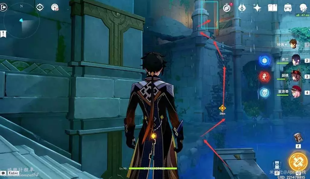 (5)劇情結束後開門進入塔內,清理風丘丘遊俠,然後往小地圖南方向出去,左轉沿著樓梯上去(途中樓梯會斷裂,如果沒趕在斷裂前過去可以直接跳下去重置位置),快到達指引處需要爬一截木板(木板也會斷裂,同樣方法也能重置木板),最後開門進入塔內清理丘丘人;