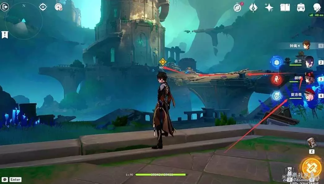 (7)清理魔物,啟動機關,然後回到中央位置,平台上升,到頂後往小地圖東南方向進入水圈傳送;