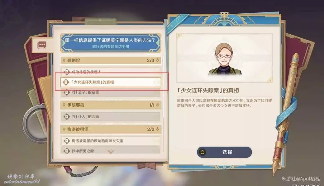 [證明芙寧娜是人類的方法]:選擇“「少女連環失蹤案」的真相”。