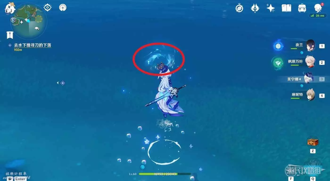 對話結束後,往碼頭旁邊的水下看,可以看到一個水圈,進入水圈隨波逐流。