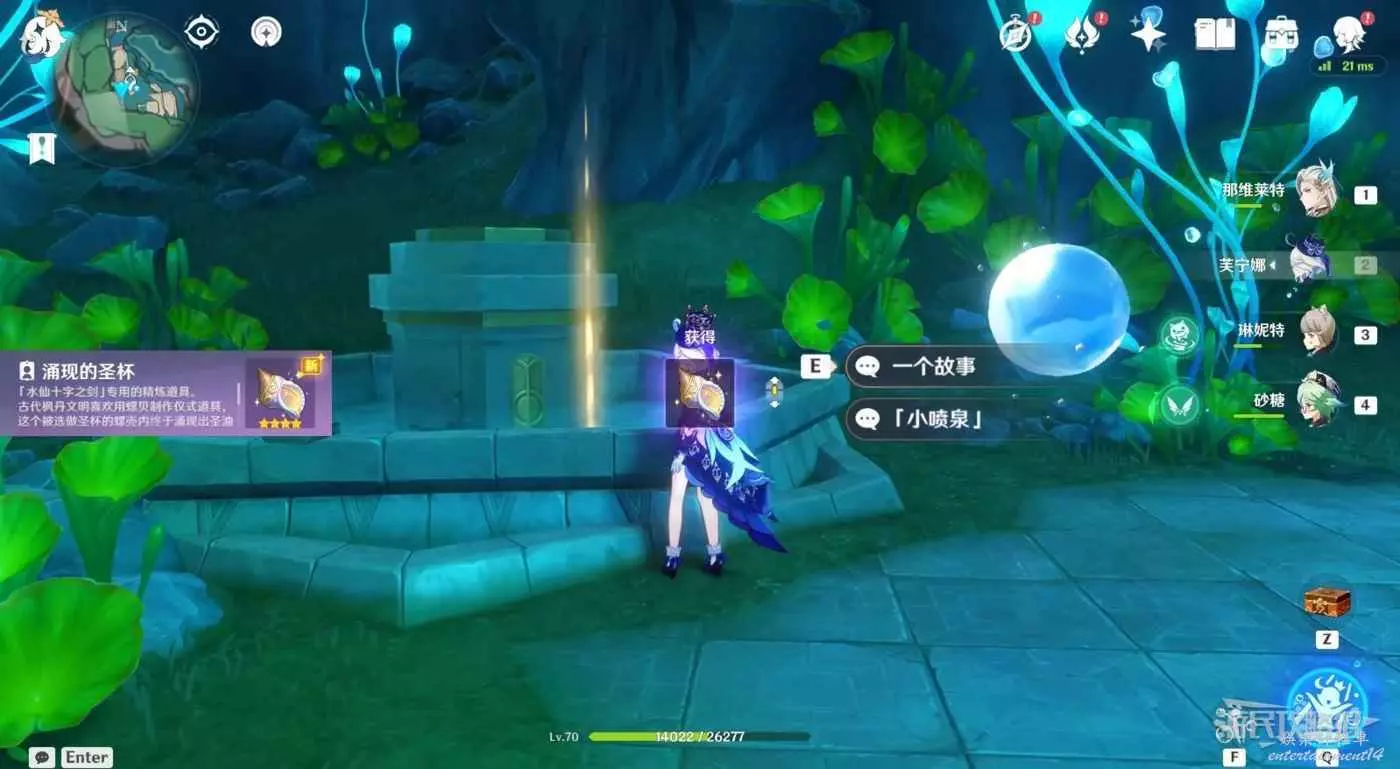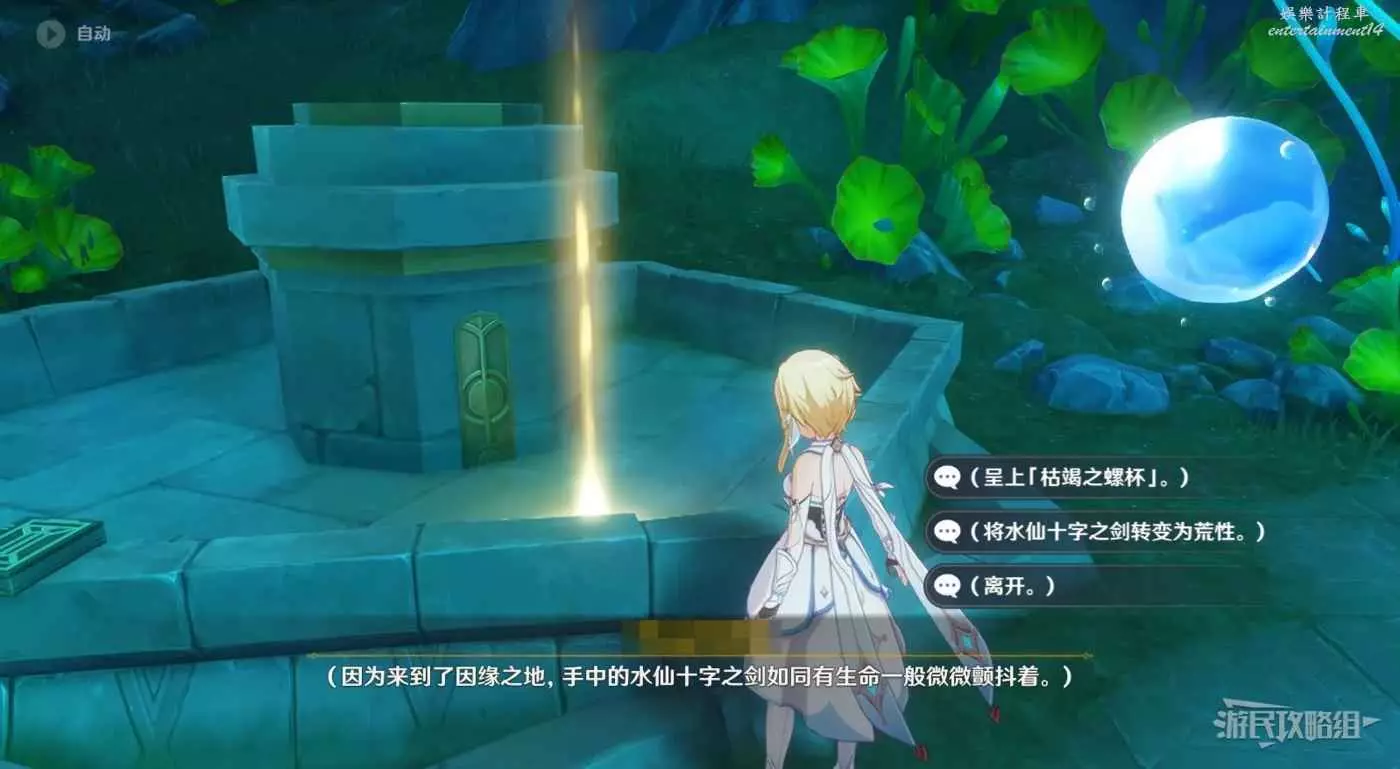 與噴泉互動選擇【小噴泉】,選擇【呈上枯竭之螺杯】即可將枯竭之螺杯轉換成【湧現的聖盃】。另外此處還可以轉換水仙十字之劍的始基力屬性,與水仙十字之劍的武器特效有關。