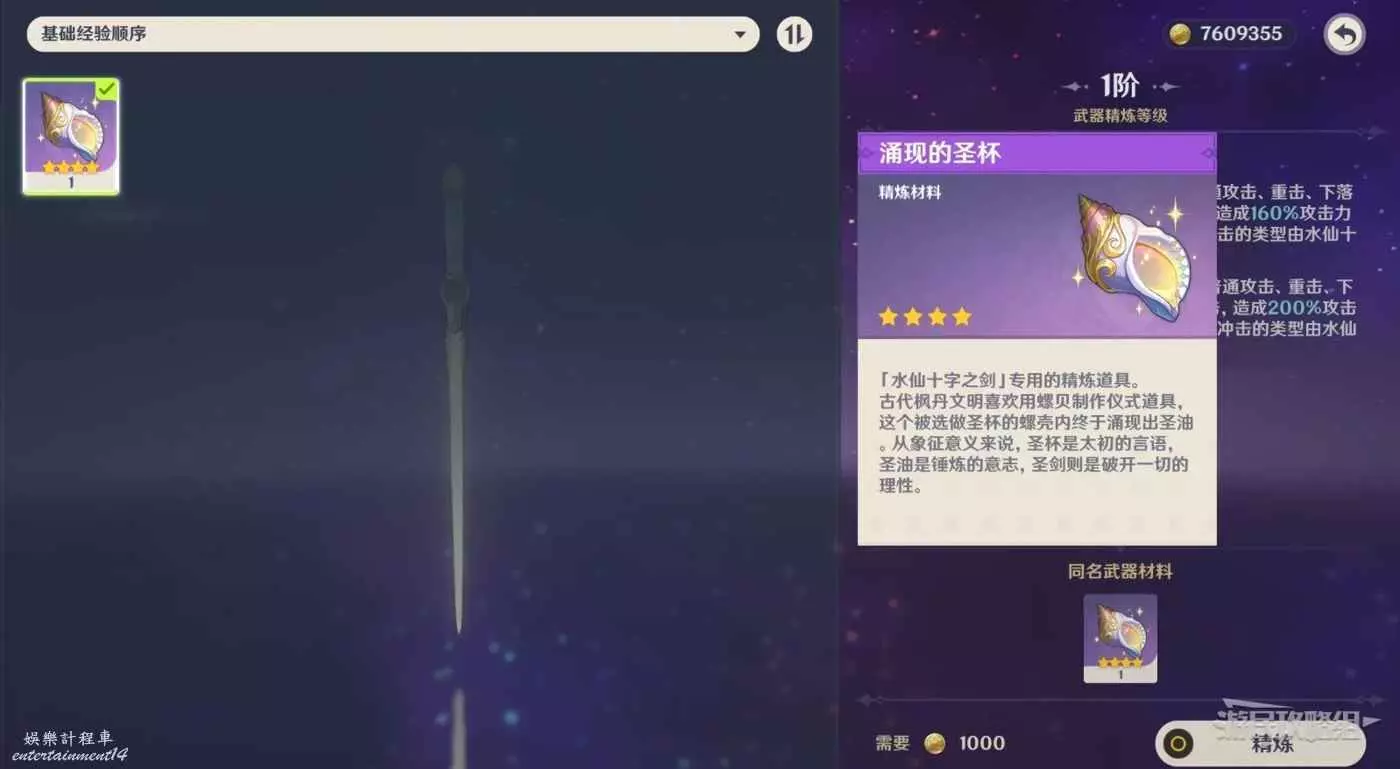 使用【湧現的聖盃】可以精煉水仙十字之劍。【湧現的聖盃】需要用【枯竭之螺杯】來轉換。