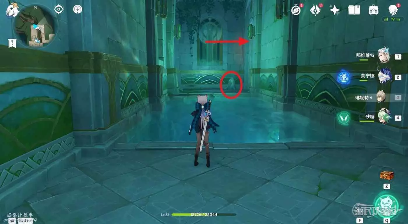 轉彎後穿過前方水域,到達對面平台,利用機關開啟大門,進入房間。