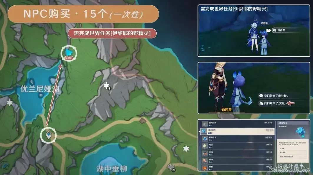非常建議做完世界任務「伊黎耶的野精靈」,本篇是做完該任務後解鎖了所有的湖光鈴蘭採集點。可戳下方卡片傳送: