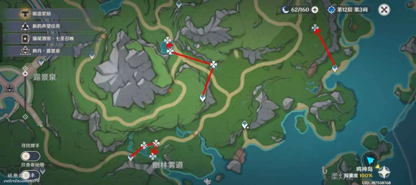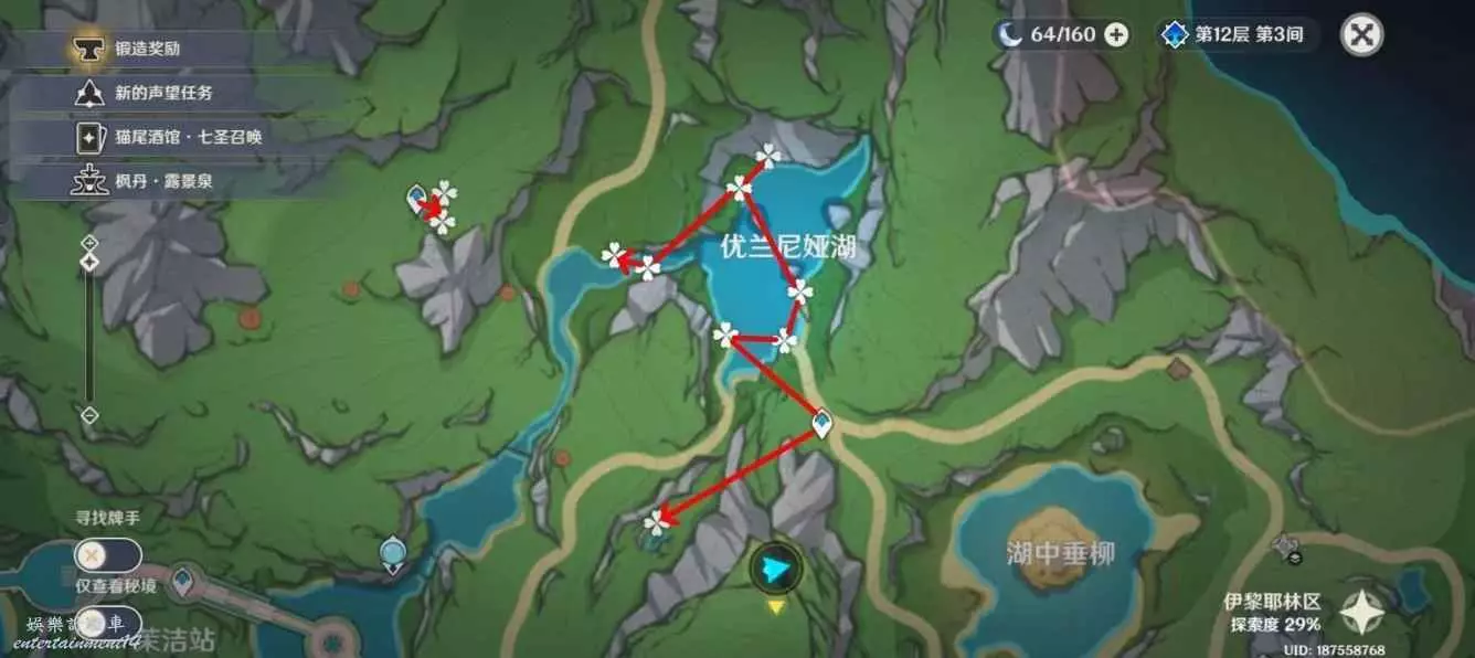 原神 (Genshin Impact) 湖光鈴蘭採集點位標註 12 11 月 2023-11-12 廣告 作者:開朗的鯤坤 來源:米遊社論壇 湖中垂柳 材料數量:32+8個 耗時:2分40秒 (湖中的「湖光鈴蘭」需要完成世界任務「伊黎耶的野精靈」才可採集,共有八個) 優蘭尼婭湖 材料數量:20個 耗時: 2分20秒 幽林霧道 材料數量:19個 耗時:2分25秒