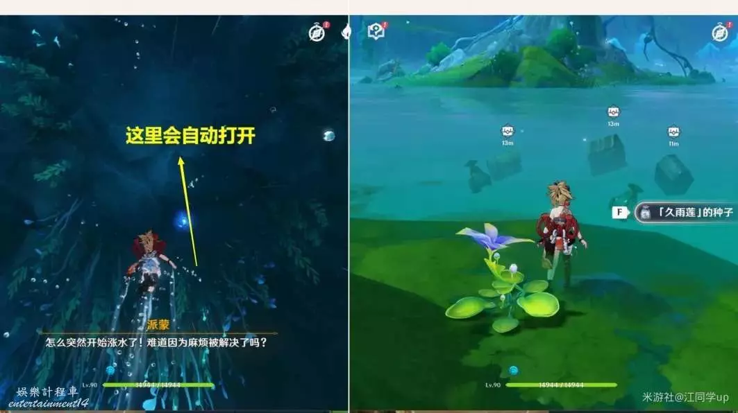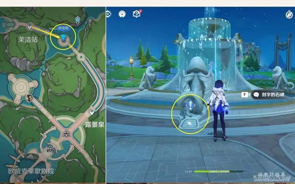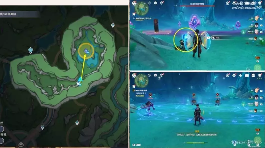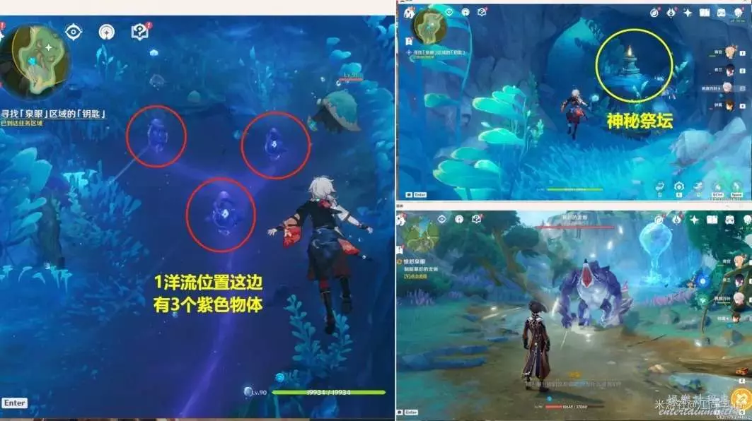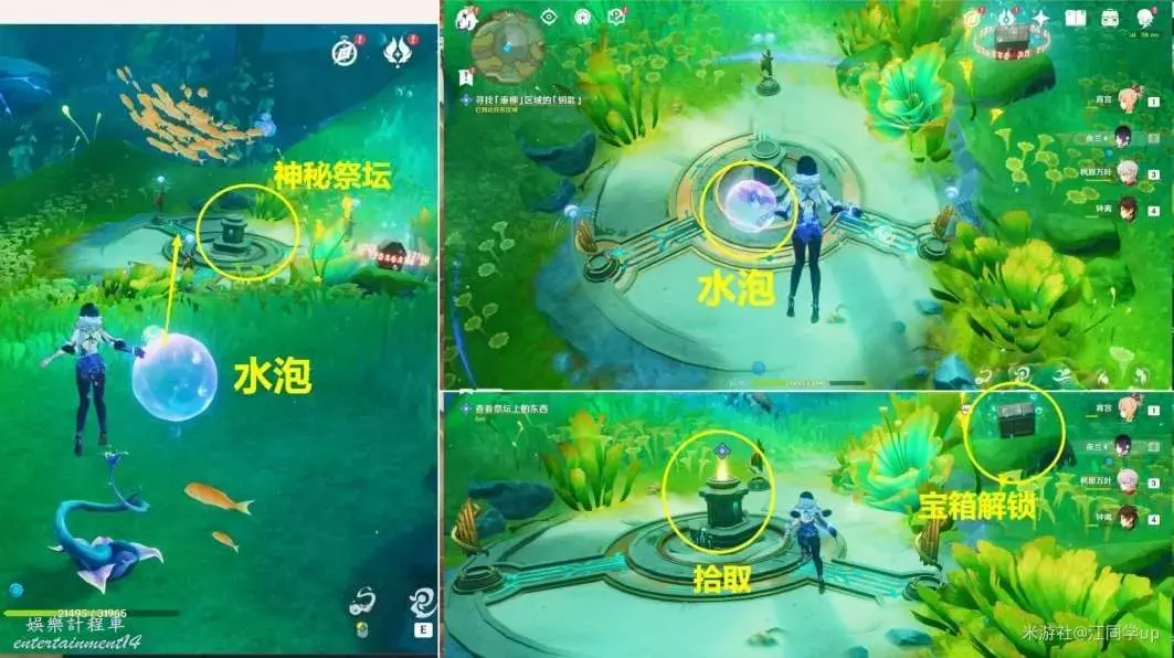 (3)打掉上圖的2個【紫色物體】後,會出現一個水泡,然後再長按E技能,將水泡移動到下圖【神秘祭壇】的我圖中位置後,再用普通攻擊打掉水泡,共鳴【神秘祭壇】周圍3個機關後完成該處解密,同時右邊寶箱解鎖,最後拾取【神秘祭壇】這裡第2個【淚滴之鑰】後,該階段任務結束
