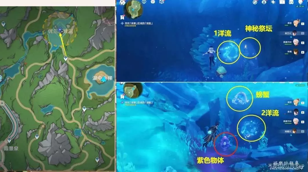 (2)傳送到下圖位置,去水下完成解密,先從1洋流這裡傳送一下,會到2洋流位置,然後獲得螃蟹的【盾反】能力,長按E技能,等2洋流這邊的【紫色物體】打我們的時候,利用【盾反】打掉【紫色物體】,然後再從2洋流傳送回到1洋流那邊去