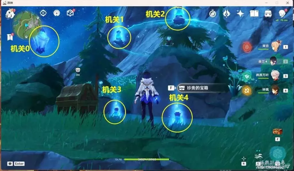 (2)然後攻擊一下左邊的機關0後,右邊4個機關就會上下旋轉起來,當機關1和機關2旋轉到和上面水圈平行位置時,再攻擊一下左邊的機關0使右邊4個機關停止旋轉,這時上面機關1和機關2處於上面水圈裡,機關3和機關4處於下面水裡,這樣就能同時啟動4個機關,同時啟動4個機關後就會完成解密,出現1個珍貴寶箱,開箱獲得第2個【幽靈枝】