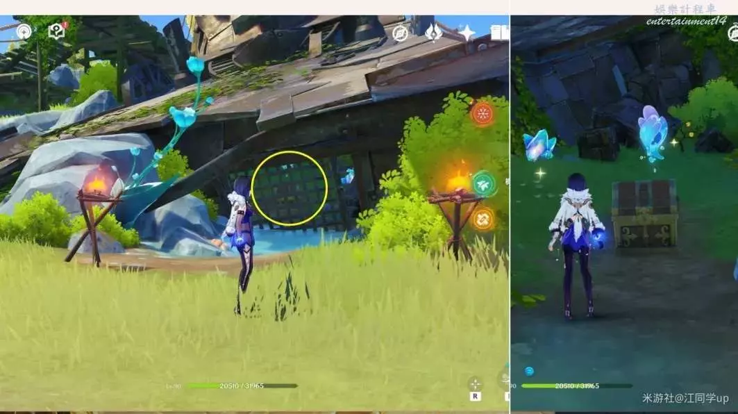 (1)來到下圖位置,先互動一下如圖裝置獲得其能力,然後長按E技能,打掉前面水面上的2個黃色物體,先打小的,再打掉大的即可