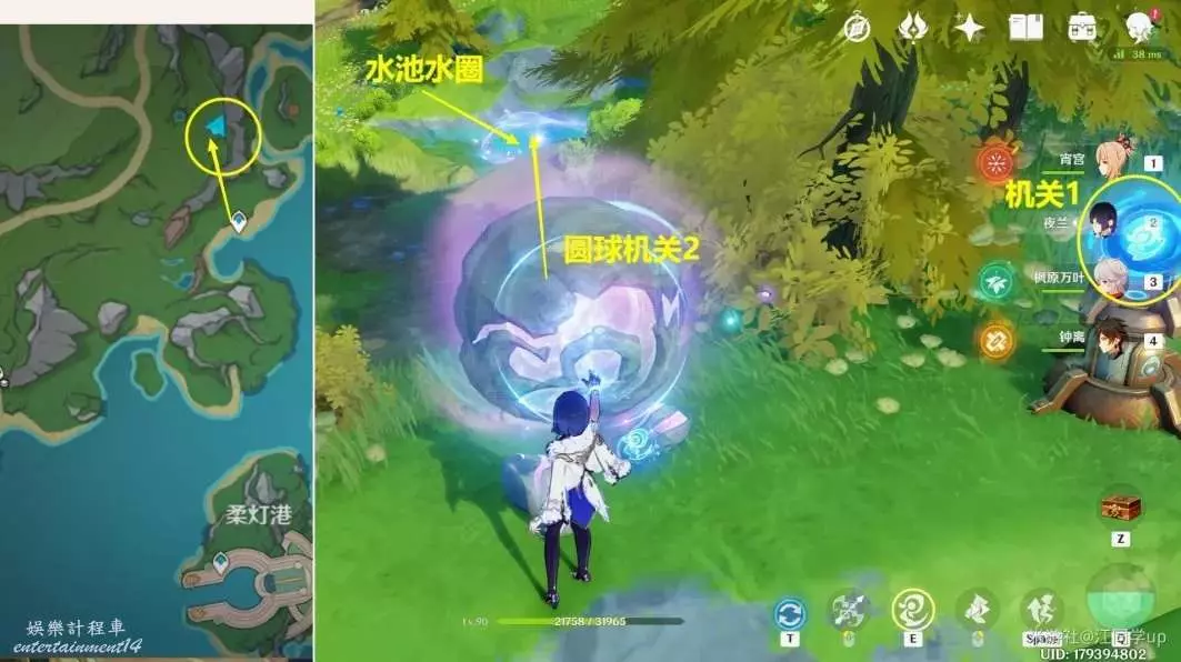 (1)來到下圖位置,先互動一下機關1獲得其能力,然後長按E技能,將圓球機關2對準下面水池的水圈後發射,將圓球機關2打到下面水池的水圈裡面後,即可完成解密,失敗了可以多試幾次即可