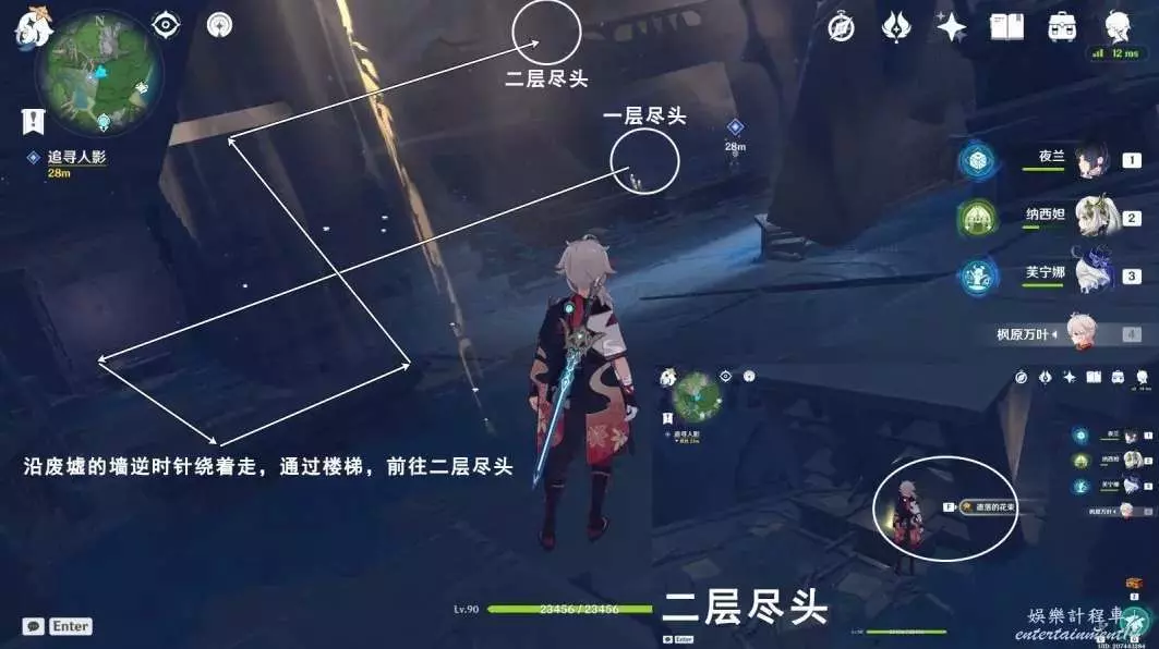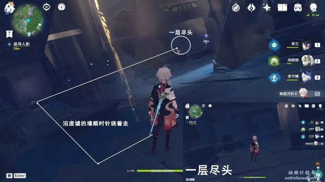 往地圖的西南方向看,沿廢墟的牆順時針繞著走,前往一層盡頭