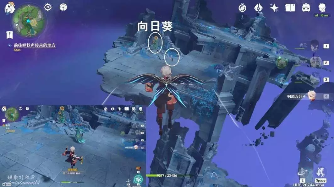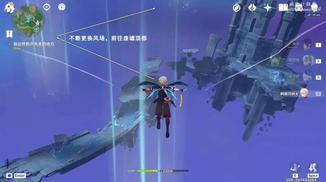 往地圖的西北方向飛,不斷更換風場,前往廢墟頂部