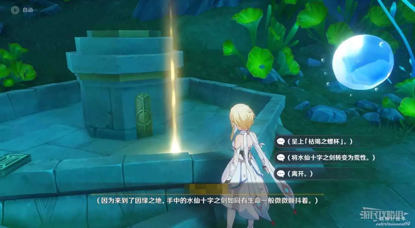 原神 (Genshin Impact) 水仙十字之劍切換屬性方法 16 11 月 2023-11-16 廣告 作者:瑞破受氣包 來源:遊民星空 水仙十字之劍切換屬性方法 需要完成4.2世界任務【藻海的尋蹤-溪舟的尾波】。完成任務後,傳送到安眠處西側地下傳送錨點。 傳送完畢後,視角拉到角色正下方,我們需要往下游離開水域落到地面上,注意不要摔死。 這裡是之前世界任務中少女的幻影出現的地方。 與噴泉互動選擇【小噴泉】即可轉換水仙十字之劍的始基力屬性,與水仙十字之劍的武器特效有關。
