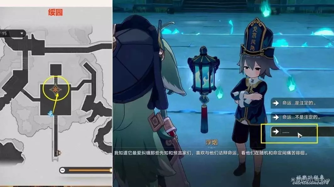 (1)然後來到【綏園】下圖位置和【浮煙】對話後,先打一波怪,然後再和【浮煙】對話時,會有1個【……】的【沉默】選項,如果還沒拿到隱藏成就《沉默開拓者》,屬於【瞬息歡愉】,那麼就選這個【沉默】選項,該成就需要【選擇沉默選項5次】後獲得