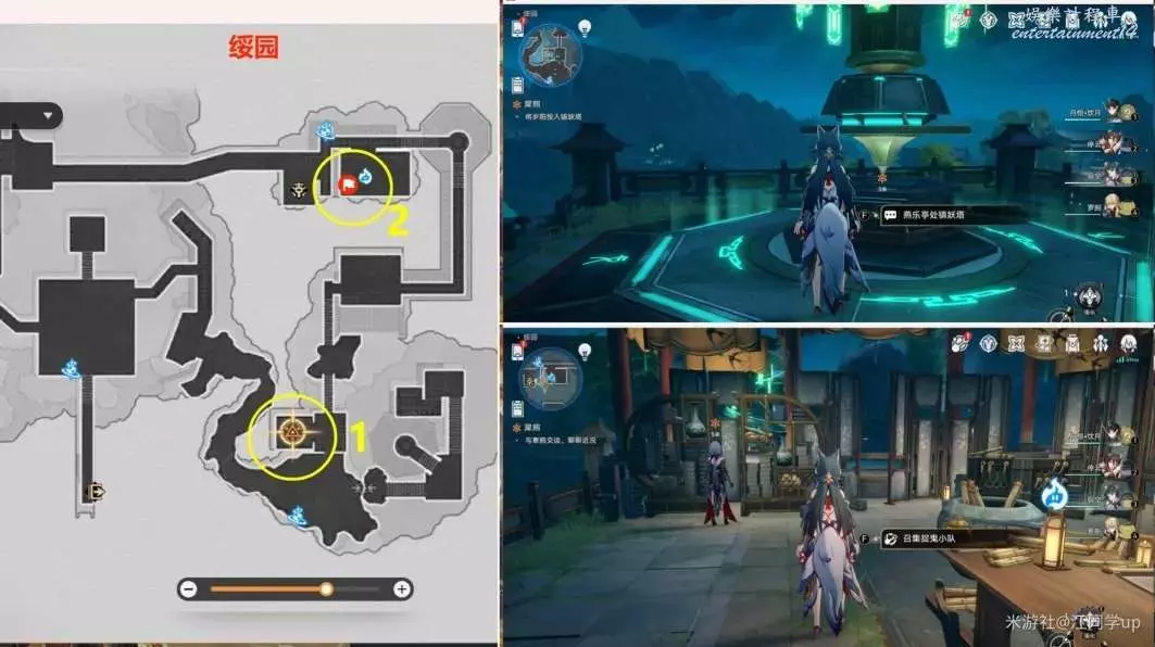 (7)然後追蹤任務,先去【綏園】下圖1任務點,將歲陽放入【鎮妖塔】中,最後再去2任務點和【寒鴉】對話後,任務【犀照】結束