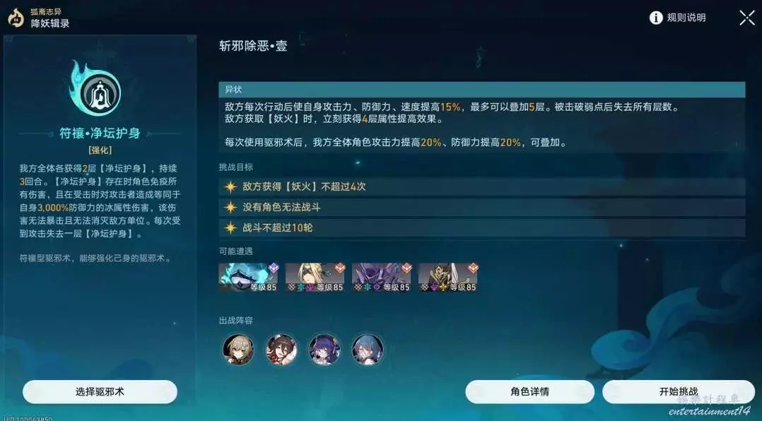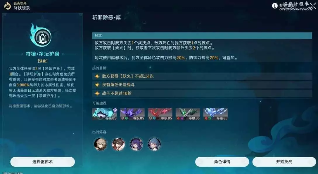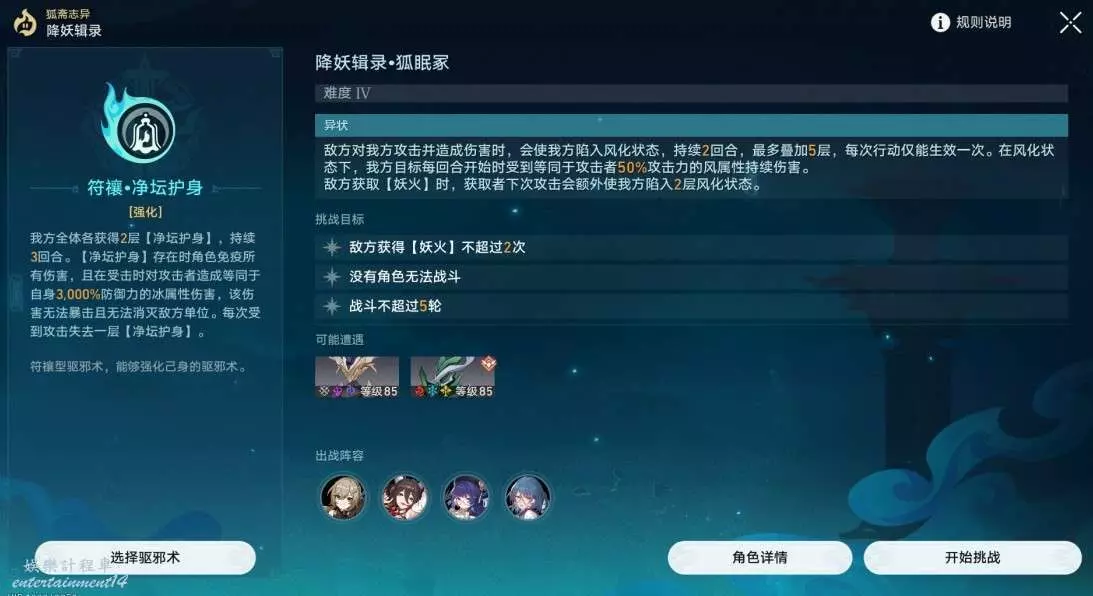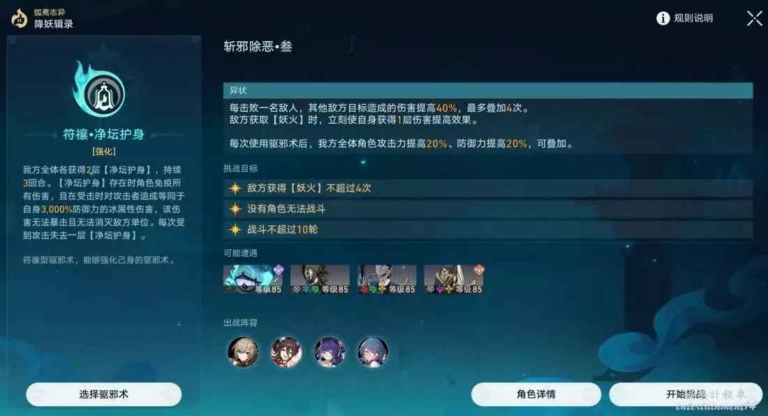 依舊是無敵陣容,但是這次戰技點有點緊缺,如果有條件的話可以把青雀換成任意有練度的智識角色。只要維持好妖火,全程無敵。