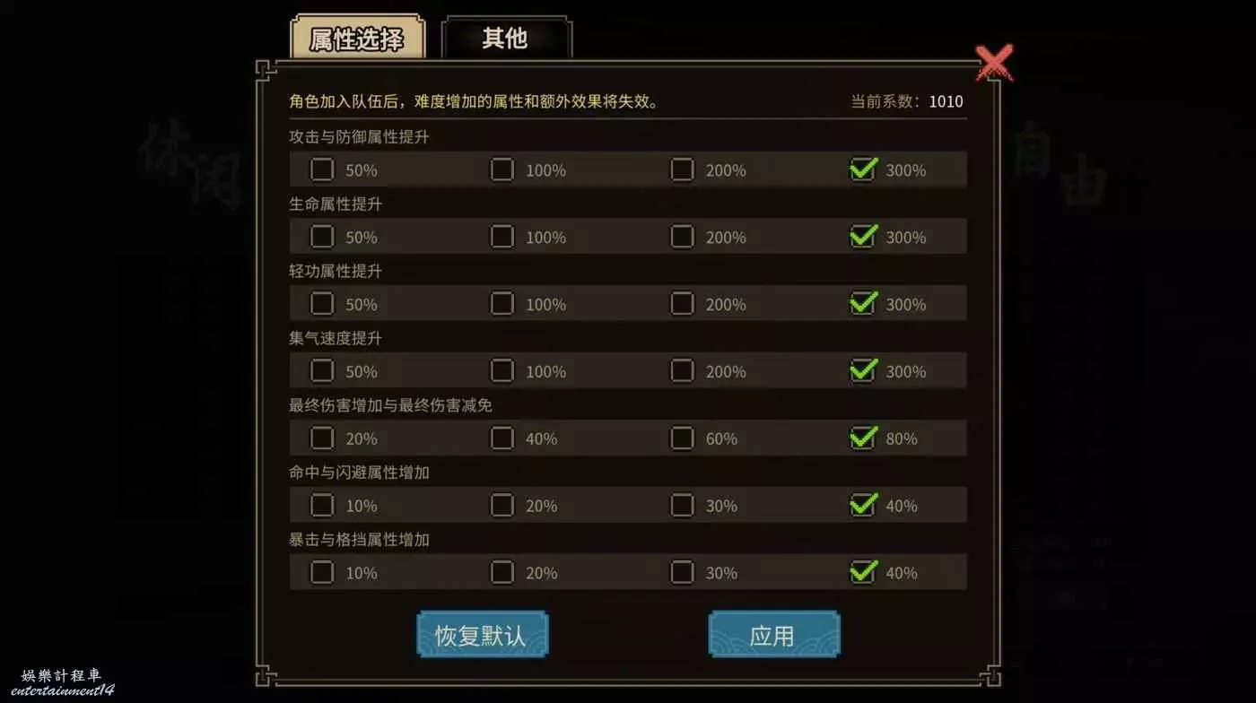 從攻防傷害等一些列數值係數、經驗獲取倍率以及NPC的狀態等均可一一自行定義,生成一個完全屬於自己的難度。