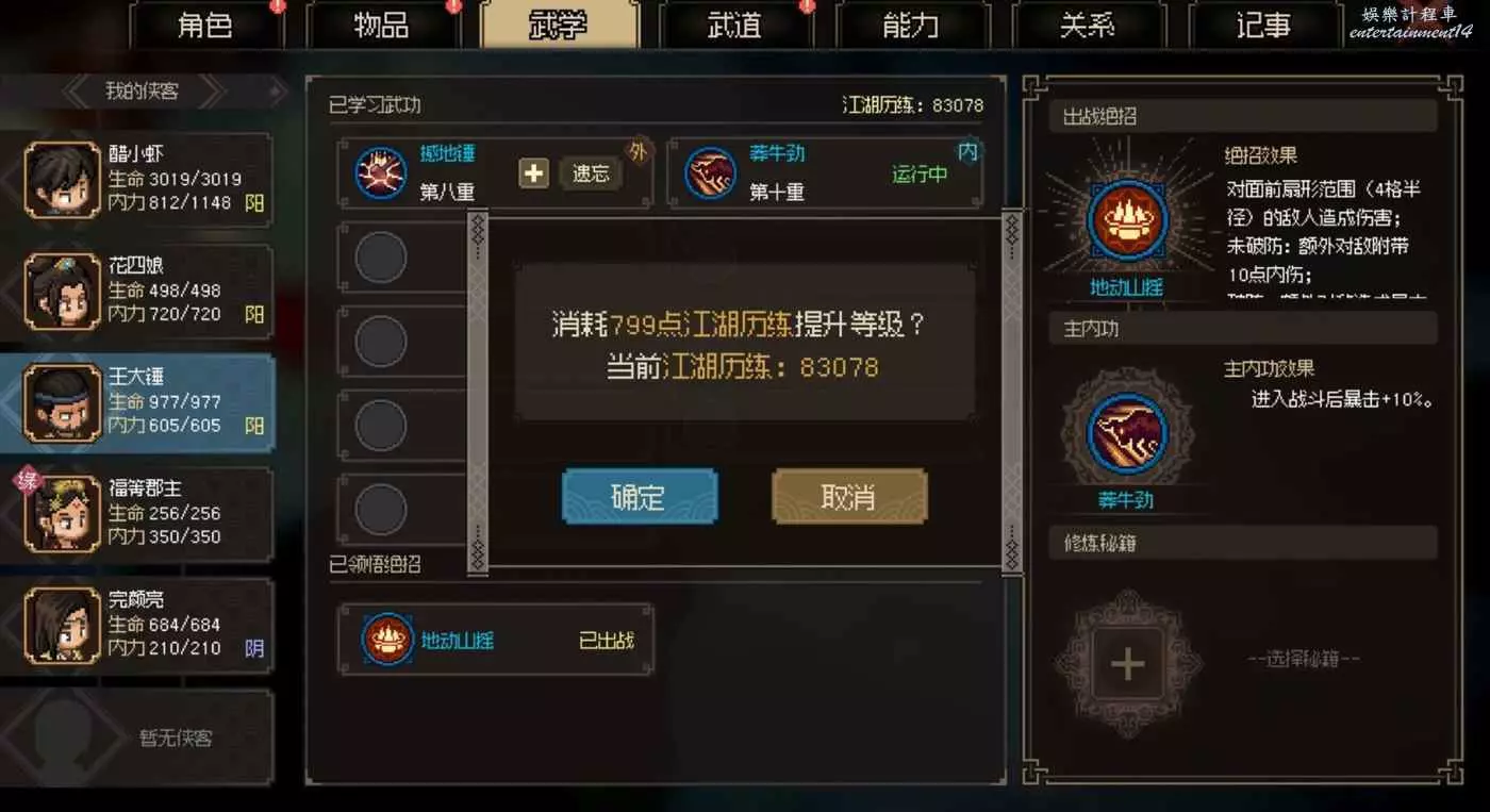 除此以外,通過完成江湖事件、城鎮懸賞獲得的歷練值,可以轉化為自己和夥伴的“儲備經驗池“,隨時根據需求分配角色經驗、武學等級,進一步提供了養成效率。