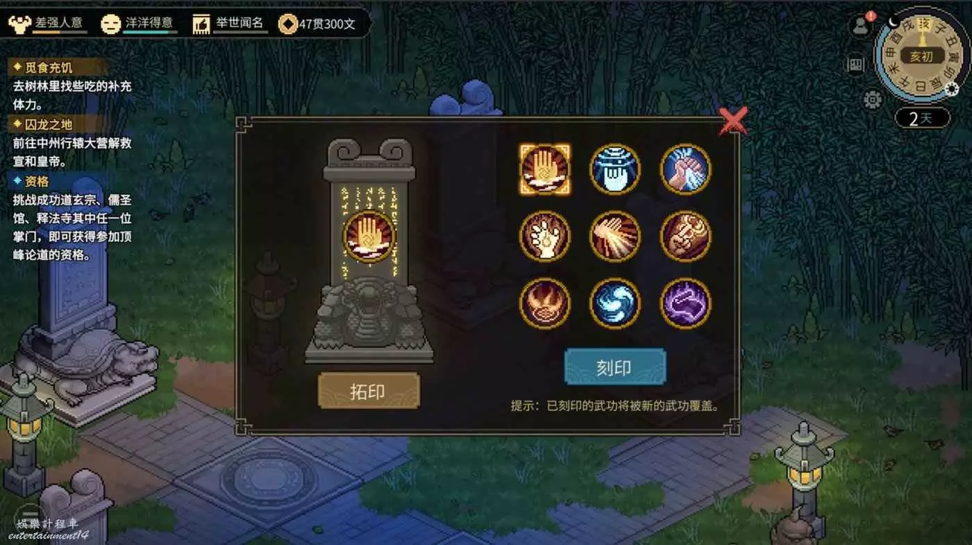 大家一定還記得在迷蹤林石碑處初次領悟強力武學的經歷。在遊歷江湖時獲得並練就的無上武學,大家肯定希望能在存檔中傳承下去,這時就可以前往後山的悟道碑進行刻印,並在下個進度中拓印學習,省去了重複獲得的麻煩。