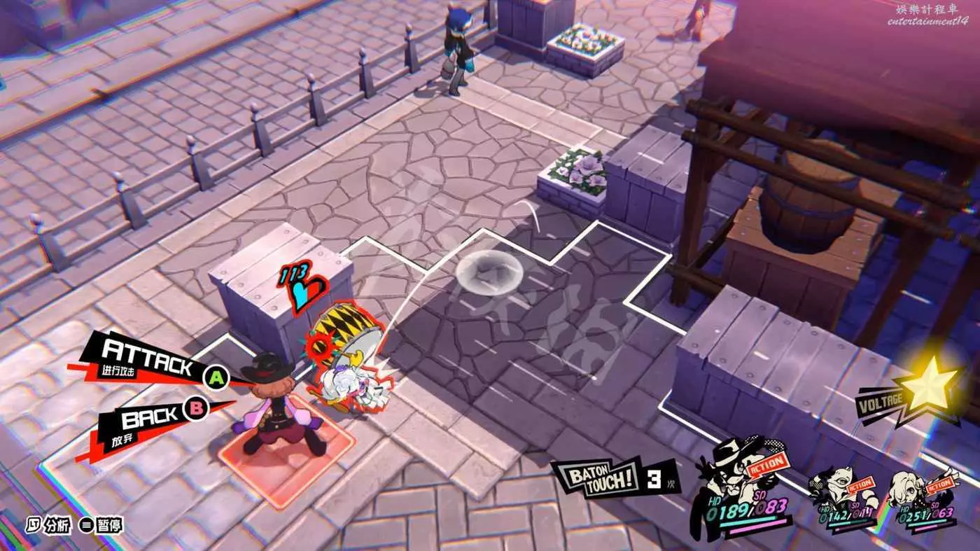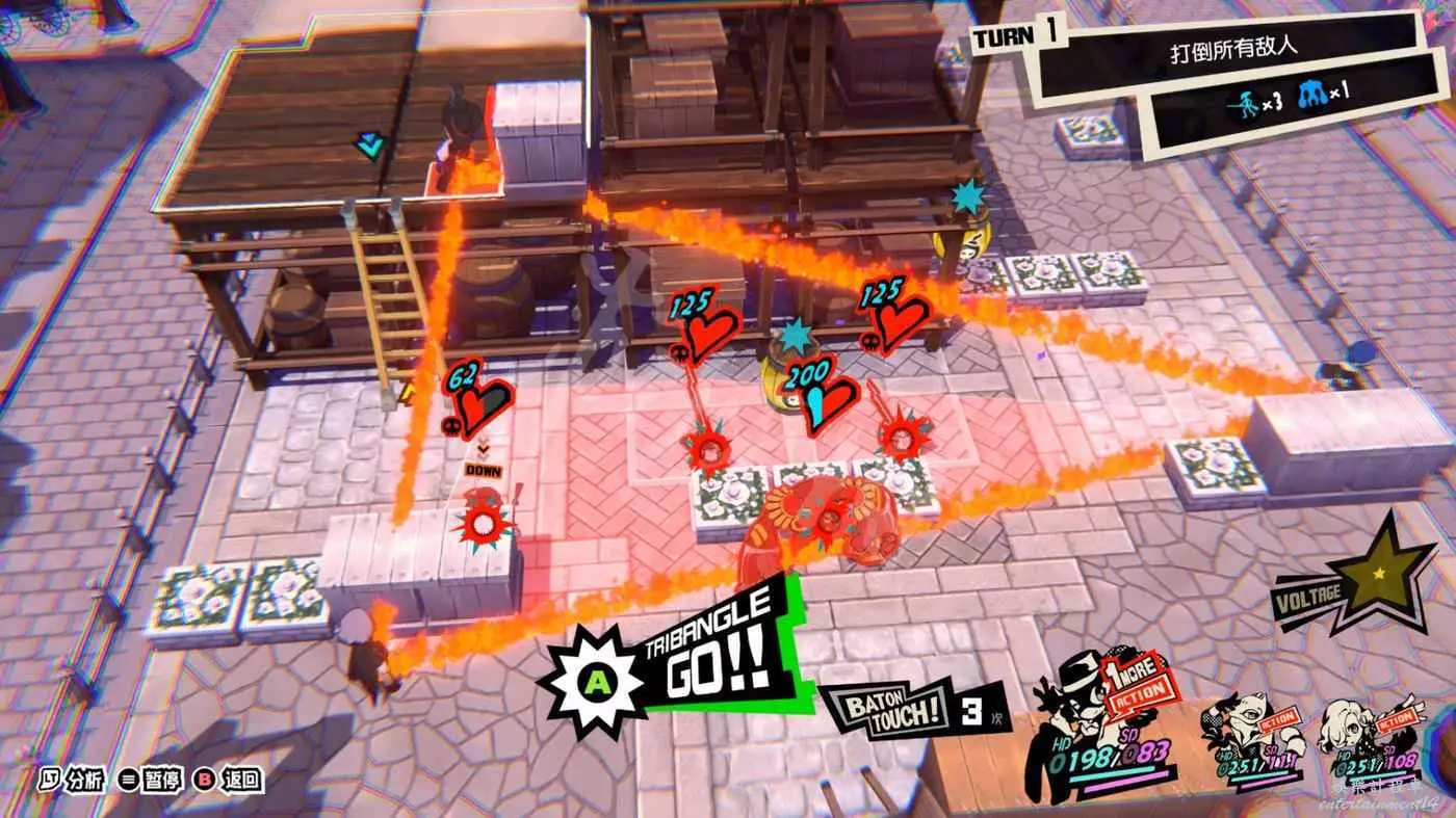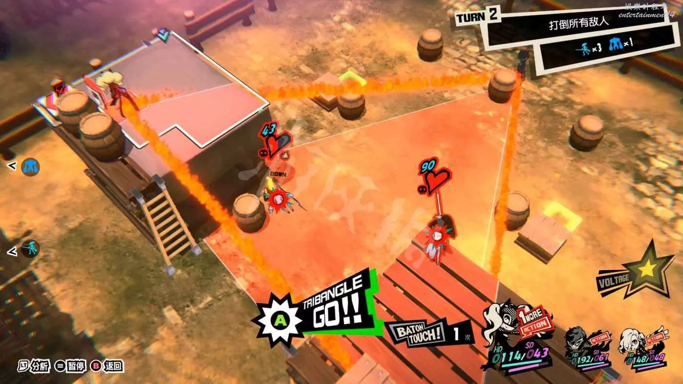 本關一上來就是關於“總攻擊”的教學,擊倒敵人後觸發“1More”,然後調整己方三名角色站位將倒地敵人包圍在三角形框線中即可對框線內敵人造成一次巨額傷害的AOE。