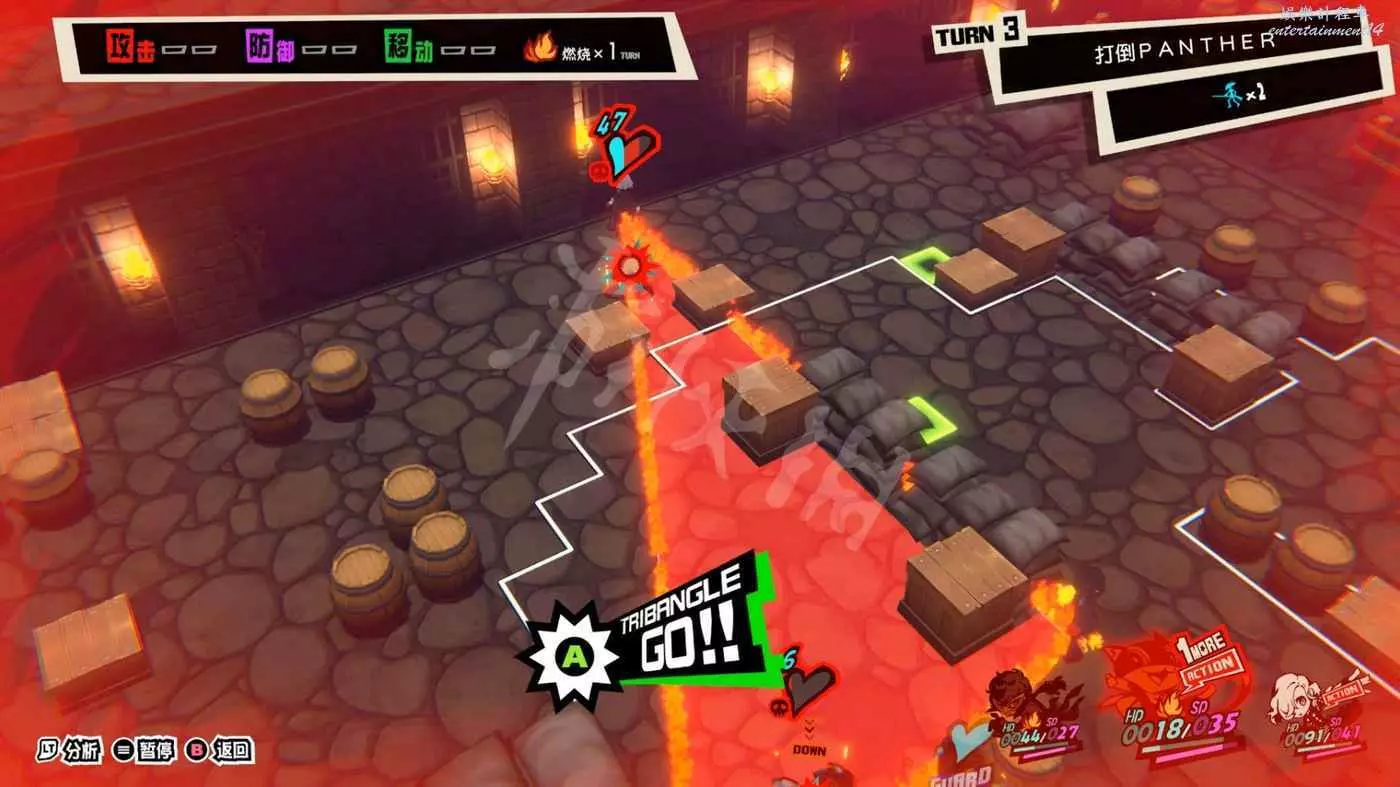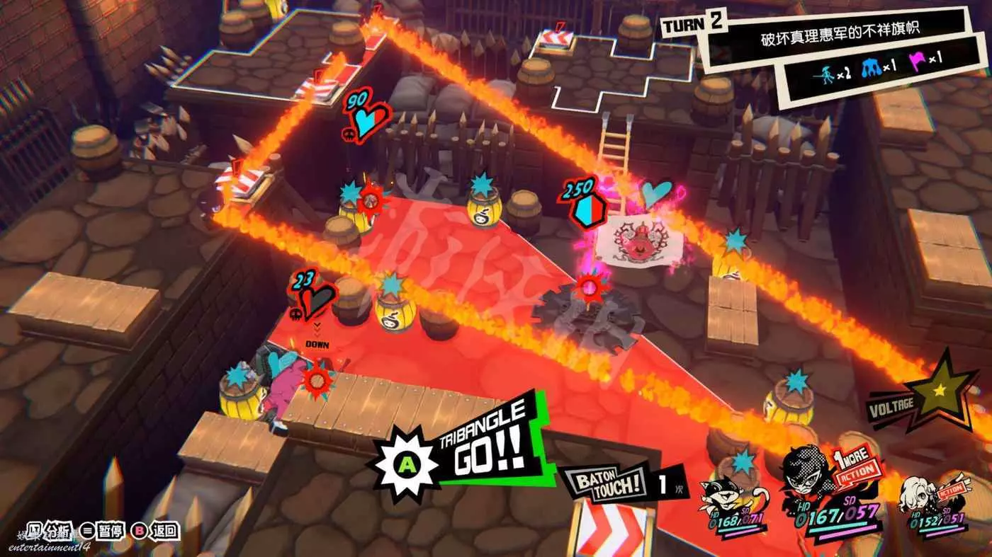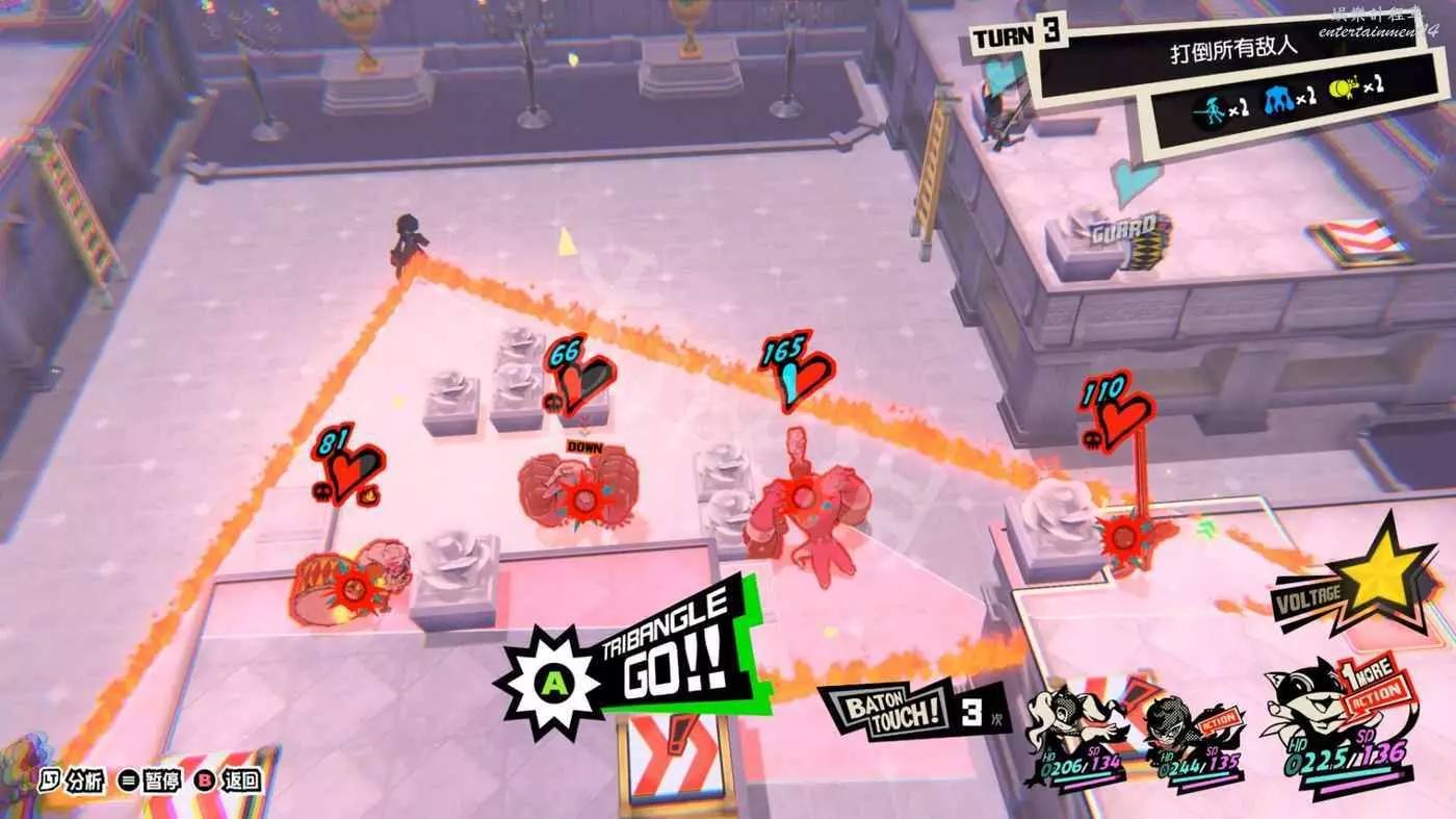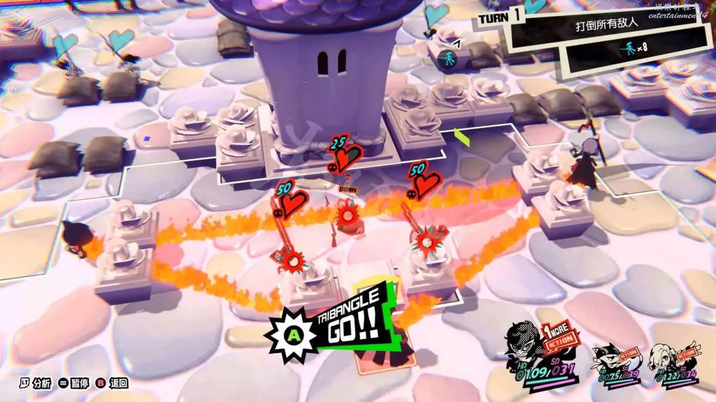 本關一上來就是關於“總攻擊”的教學,擊倒敵人後觸發“1More”,然後調整己方三名角色站位將倒地敵人包圍在三角形框線中即可對框線內敵人造成一次巨額傷害的AOE。