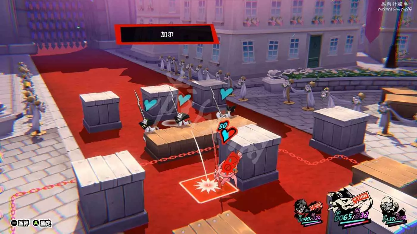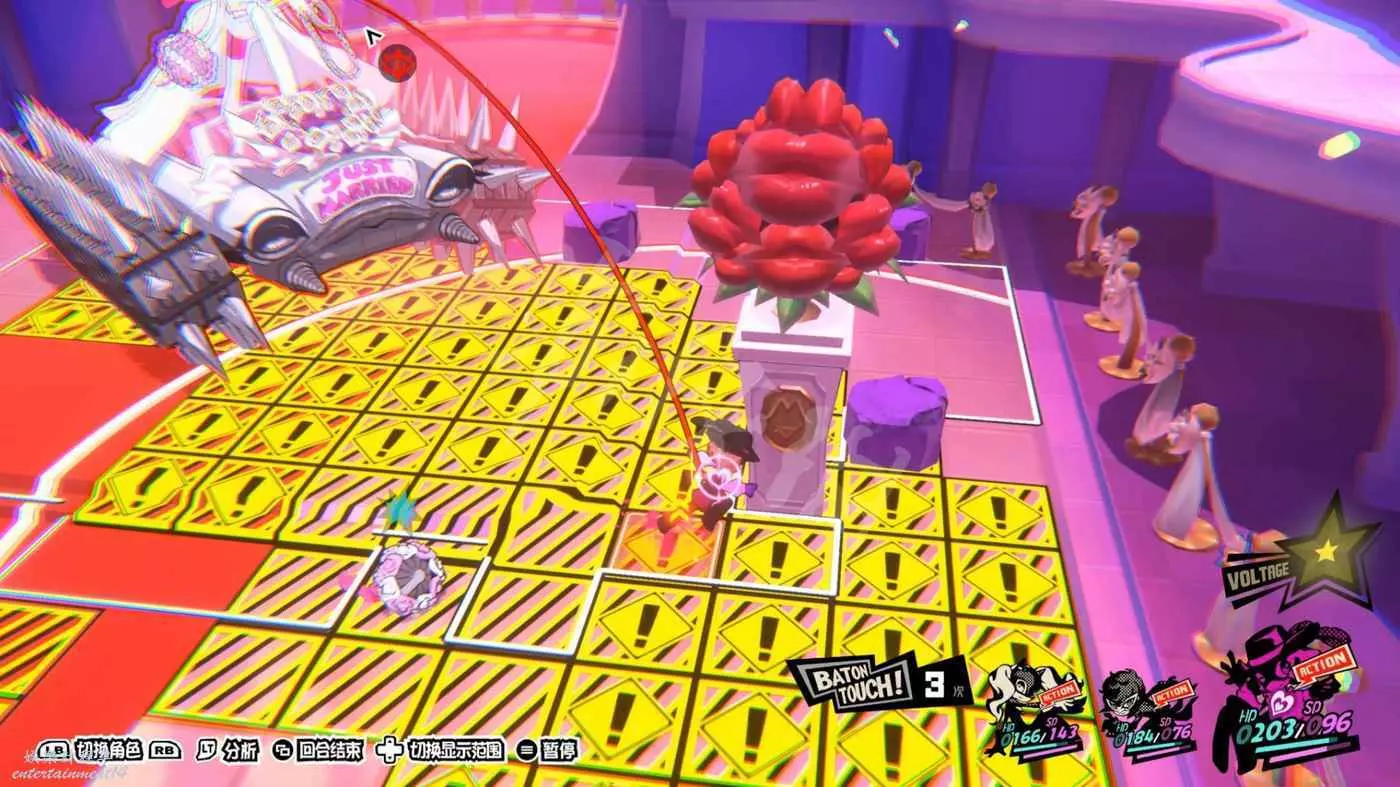 三階段是劇情殺,需要將Boss勾引到場地中心的藍色區域內(直接全員進藍框待機)。等她扔花束+準備直線衝刺時,把花束打到Boss的前進路線上,讓Boss在能夠恰夠停在框內,觸發劇情。