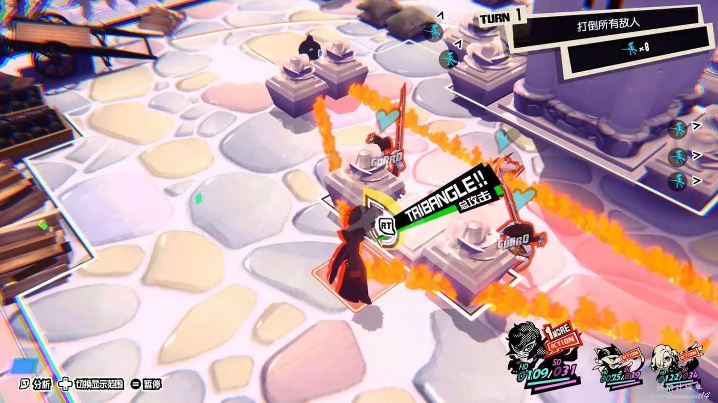 當我方角色進入“1 More”狀態後,可以通過調整角色站位將敵方倒地角色包圍在一個三角形的包圍網中,進而觸發“總攻擊(TRIBANGLE)”,對三角形範圍內的所有敵人造成一次傷害極高的AOE攻擊。