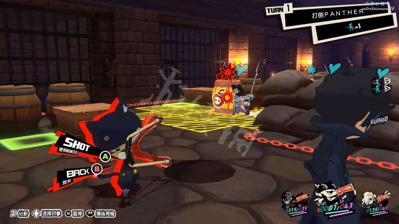 解決掉4個槍手後會在場景右下角出現新的反擊類敵人“守衛”,面對守衛時需要先攻擊一次打出他的反擊狀態,攻擊時注意儘量離開黃色條紋標記的地板塊,解除反擊狀態後再次攻擊可使其倒地。