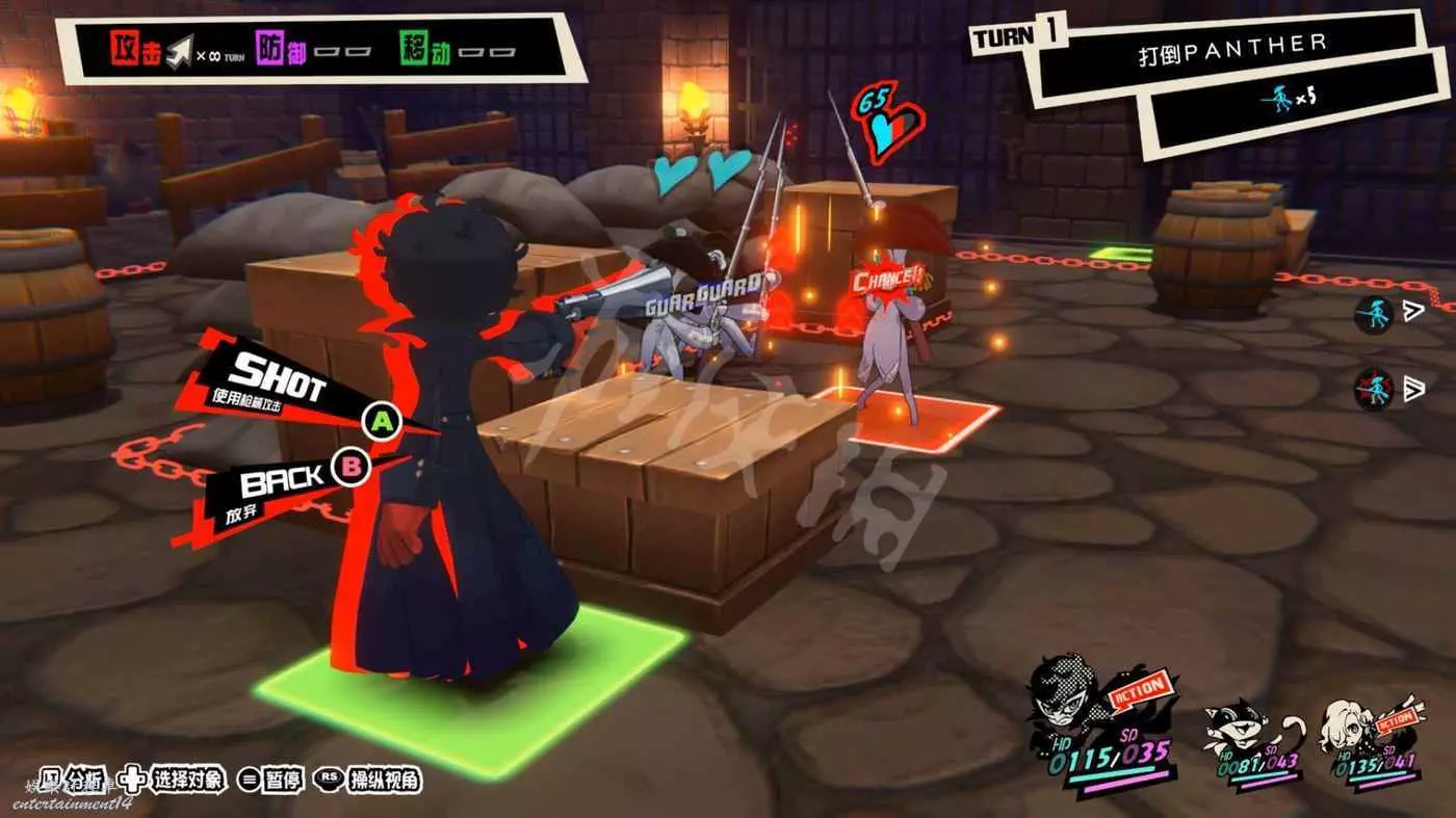本關的勝利條件是打倒PANTHER,要注意包括PANTHER,在內所有被洗腦的怪盜團成員是不會擊倒的,所以最好是利用場地裡的雜兵製造“總攻擊”的機會,將PANTHER框在三角形內造成大量傷害。