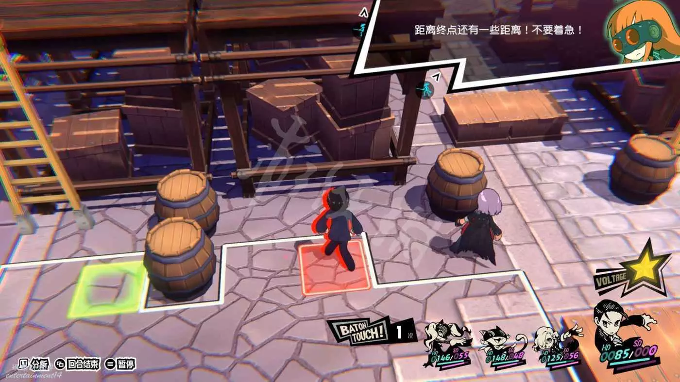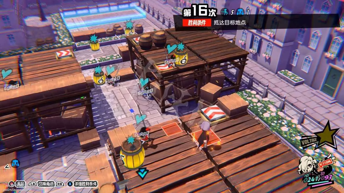 雖然是逃脫關,但是額外獎勵的要求是擊倒所有敵人,個人建議是一定選擇一個對群能力強的角色(推薦NOIR奧村春)走下面,再選擇高機動力角色(例如摩爾迦納)爬梯子走右手邊高臺。