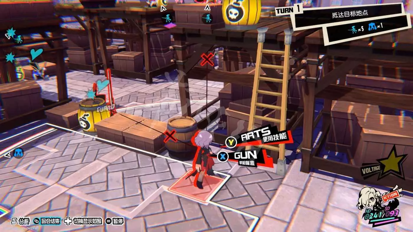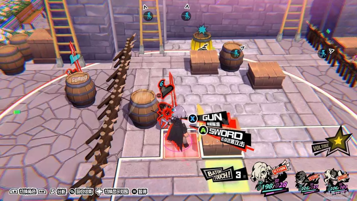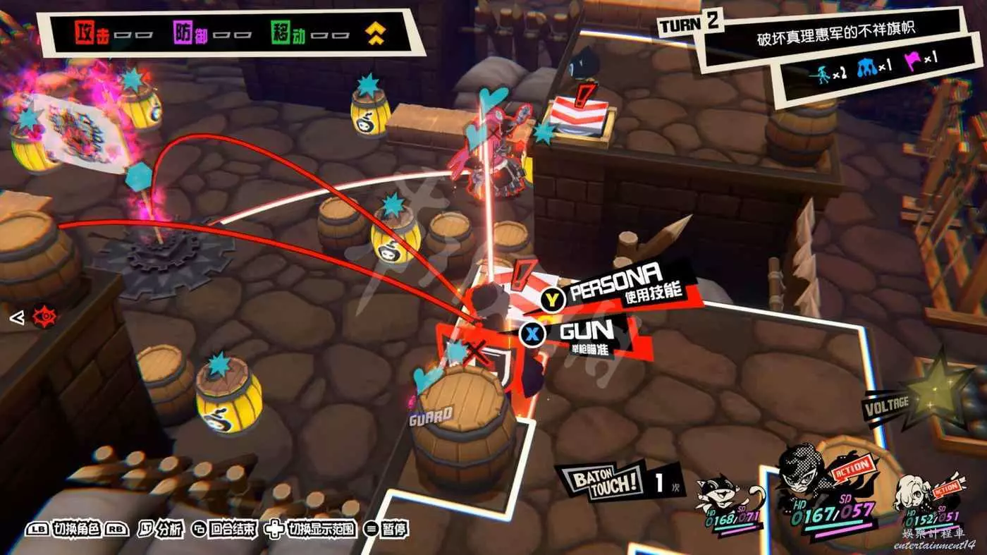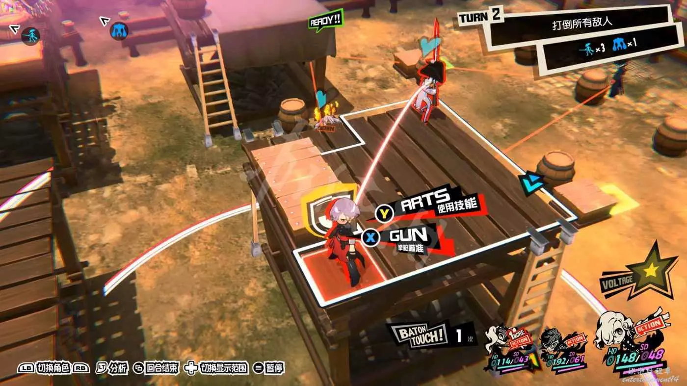 打法思路類似,先爬梯子上高臺,然後利用技能或引爆炸藥桶來製造“1More”的機會,然後調整站位將旗幟框在“總攻擊”的三角形內。